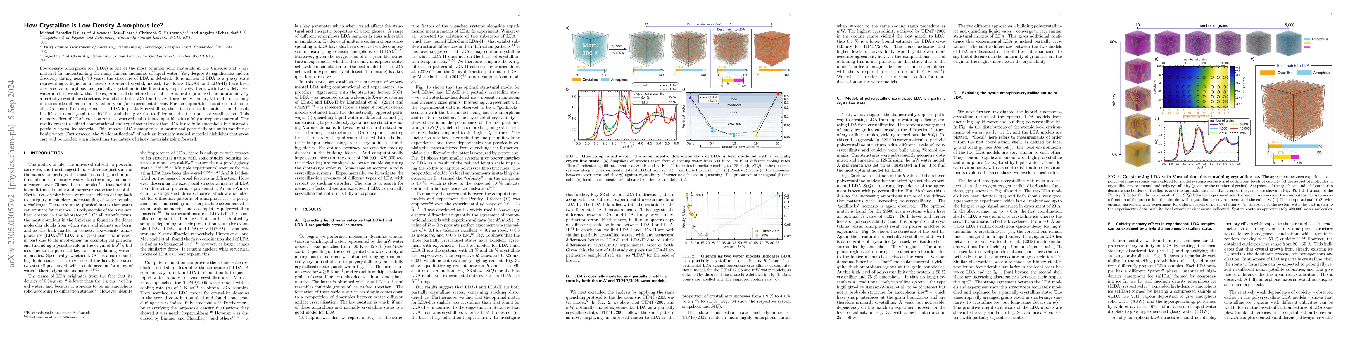 The paper presents a computational model that explains the structure of LDA as composed of small crystalline ice grains with amorphous boundaries, challenging the previous notion of LDA as a glassy state.