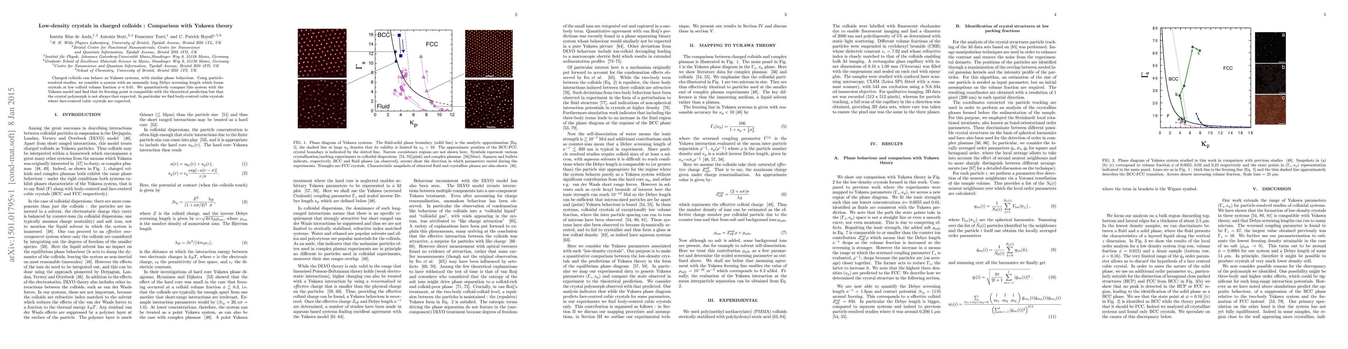 Charged colloids with a long Debye screening length form low-density crystals at low volume fractions, and their freezing point aligns with Yukawa theory predictions, though the observed crystal structure deviates from the expected face-centred cubic, instead forming body-centred cubic crystals.