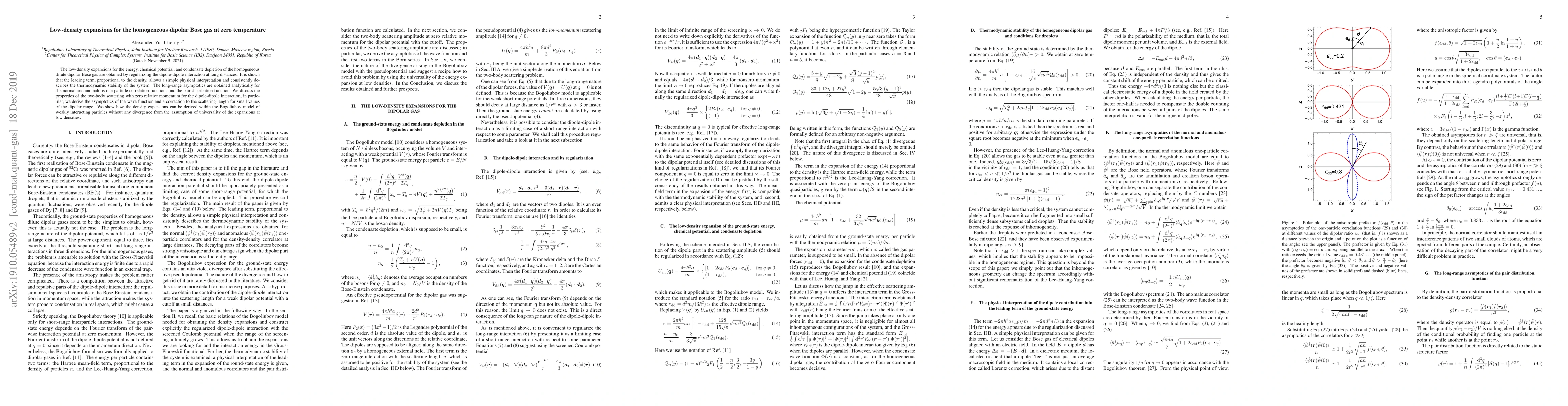 This paper derives low-density expansions for the energy, chemical potential, and condensate depletion of a homogeneous dipolar Bose gas, showing that the leading term proportional to density describes thermodynamic stability. It also provides analytical results for correlation functions and discusses the scattering properties of dipole-dipole interactions.