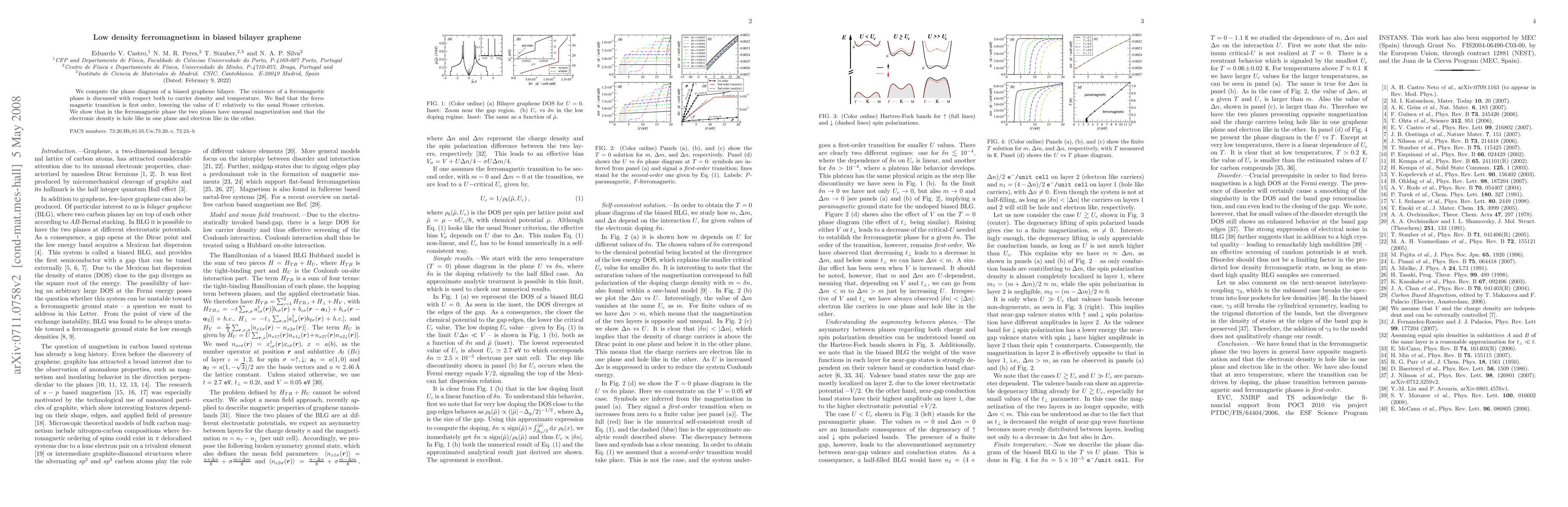 We compute the phase diagram of a biased graphene bilayer. The existence of a ferromagnetic phase is discussed with respect both to carrier density and temperature. We find that the ferromagnetic transition is first order, lowering the value of $U$ relatively to the usual Stoner criterion. We show that in the ferromagnetic phase the two planes have unequal magnetization and that the electronic density is hole like in one plane and electron like in the other.