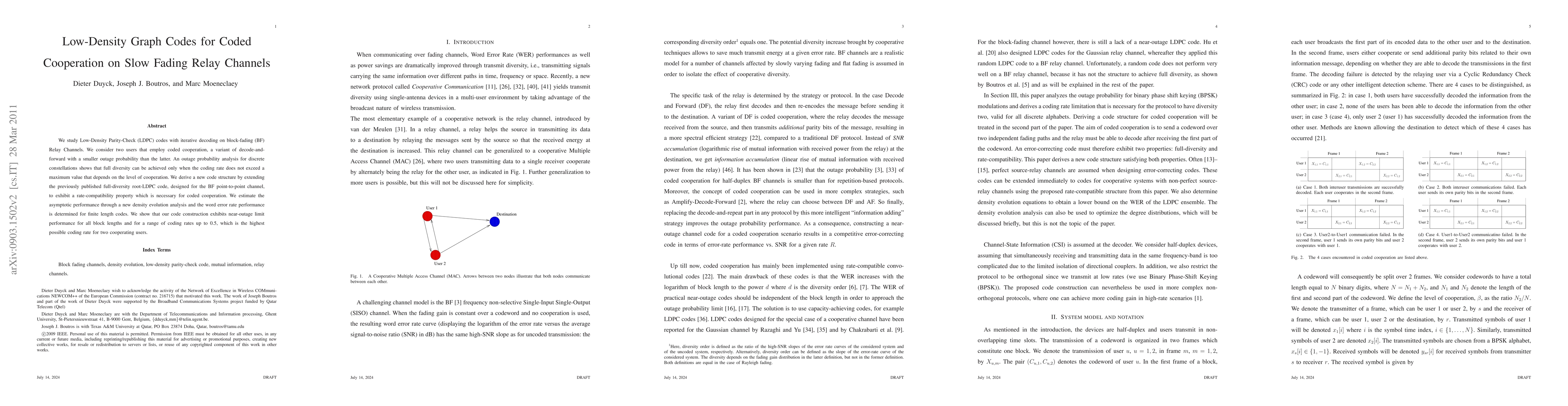 This paper investigates Low-Density Parity-Check (LDPC) codes for block-fading relay channels with coded cooperation, achieving full diversity under certain coding rates. A new code structure is developed to support this cooperation, demonstrating near-outage limit performance for coding rates up to 0.5.