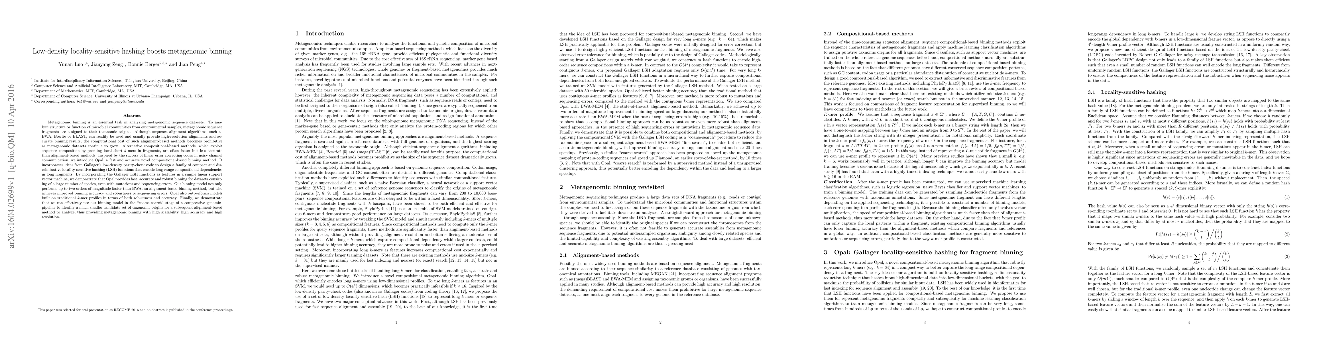 Opal introduces a novel compositional-based binning method leveraging low-density locality-sensitive hashing for efficient metagenomic sequence analysis, achieving significant speedups and accuracy improvements over traditional alignment-based methods. This method enhances scalability and robustness, enabling high-resolution binning even in large, complex datasets.