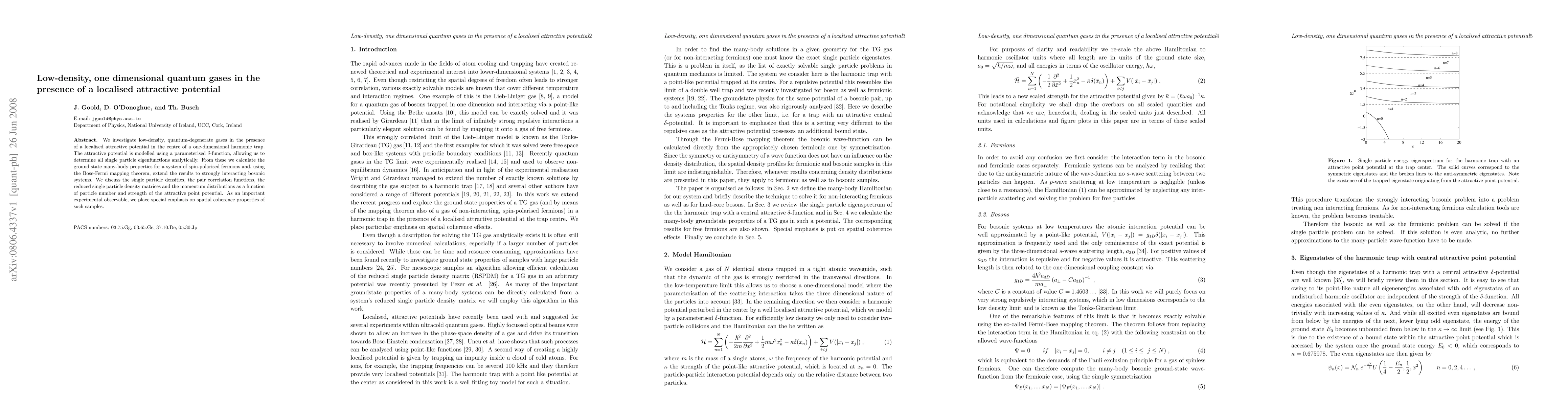 This paper studies low-density, one-dimensional quantum gases with a localised attractive potential in a harmonic trap, determining single particle eigenfunctions analytically. It examines ground state properties for spin-polarised fermions and extends findings to bosonic systems using the Bose-Fermi mapping theorem, focusing on spatial coherence as an important experimental observable.