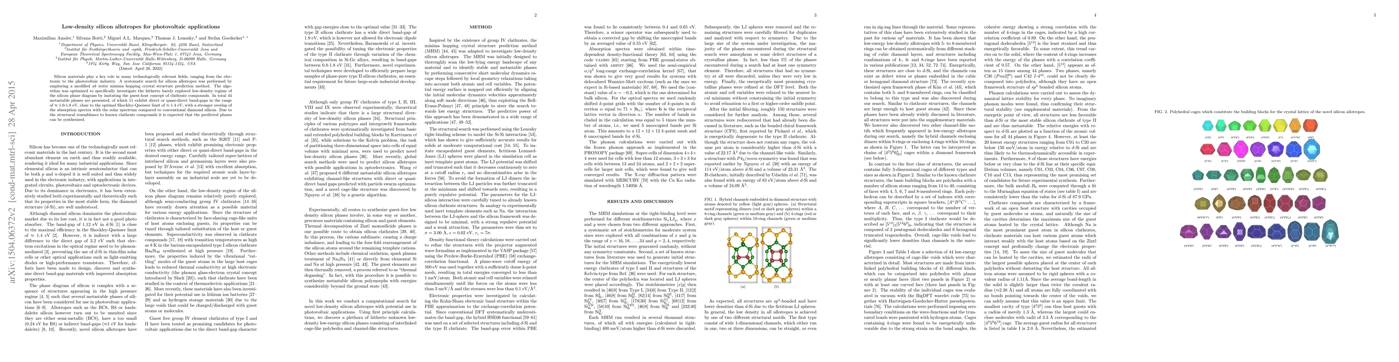 This paper explores low-density silicon allotropes using an ab initio method, predicting 44 metastable phases. Among them, 11 exhibit direct or quasi-direct band-gaps suitable for photovoltaic applications, with absorption spectra that better match the solar spectrum compared to conventional silicon.