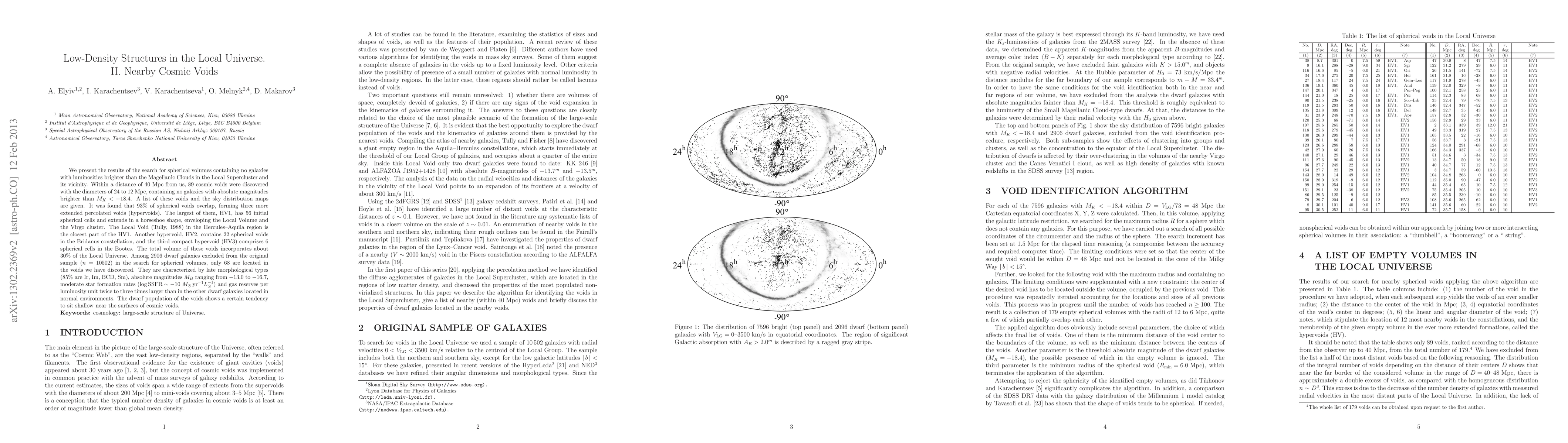 This paper identifies 89 cosmic voids within 40 Mpc of the Local Supercluster, each containing no galaxies brighter than the Magellanic Clouds. The voids merge to form three larger hypervoids, with the largest encompassing the Local Volume and Virgo cluster. Dwarf galaxies in these voids exhibit late types and higher gas reserves compared to those in normal environments.