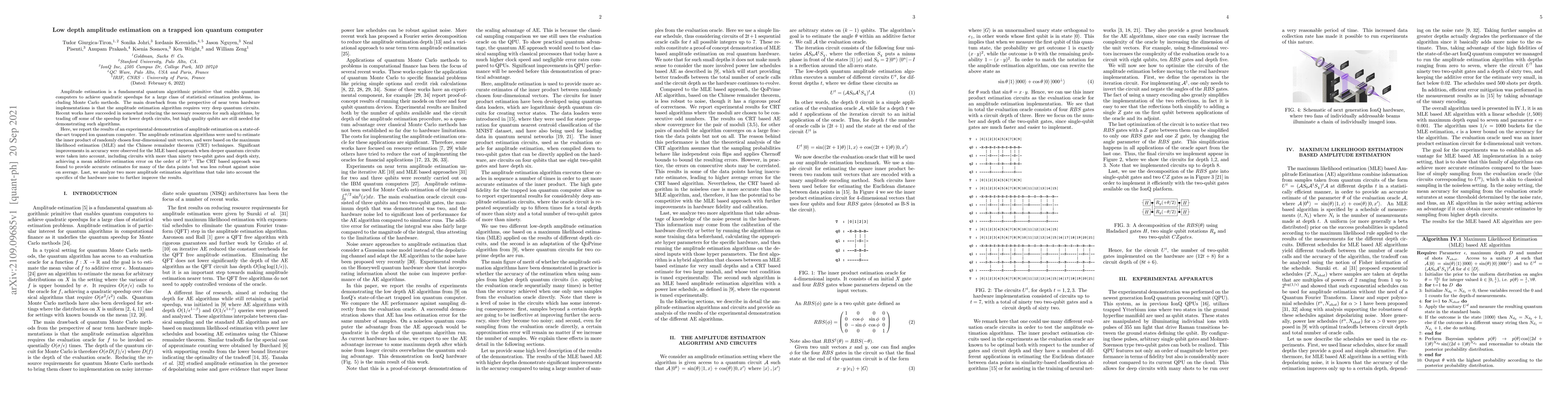 The paper presents experimental demonstration and analysis of low-depth amplitude estimation algorithms on a trapped ion quantum computer, including MLE and CRT-based methods, along with noise-aware power-law MLE algorithms.