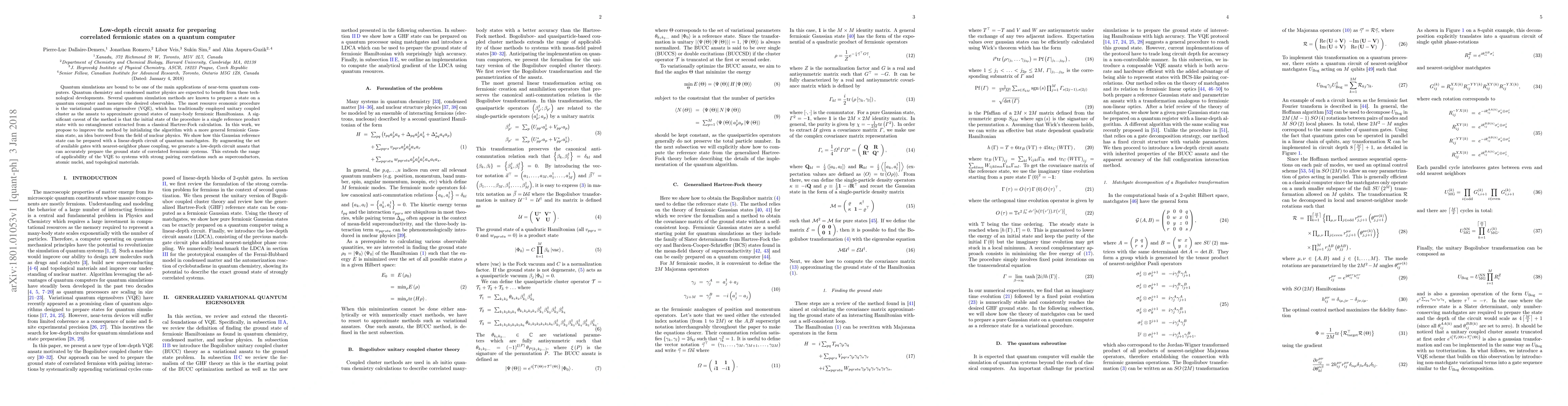 This paper proposes a low-depth circuit ansatz to prepare correlated fermionic states on a quantum computer, improving the variational quantum eigensolver (VQE) by initializing with a fermionic Gaussian state. This approach extends VQE's applicability to systems with strong pairing correlations, such as superconductors, atomic nuclei, and topological materials.