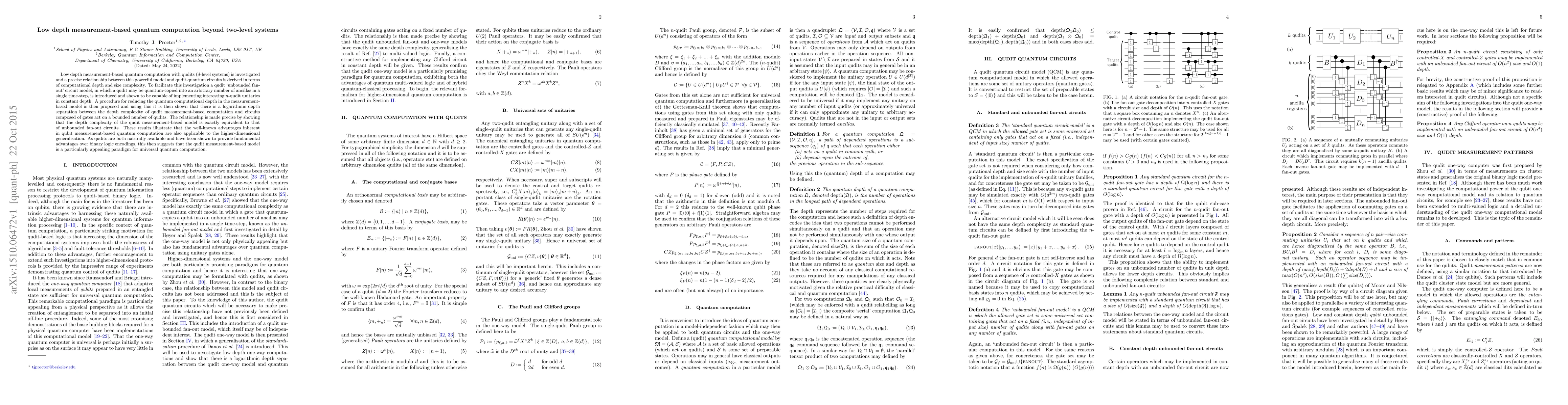 Low depth measurement-based quantum computation with qudits ($d$-level systems) is investigated and a precise relationship between this powerful model and qudit quantum circuits is derived in terms of computational depth and size complexity. To facilitate this investigation a qudit `unbounded fan-out' circuit model, in which a qudit may be quantum-copied into an arbitrary number of ancillas in a single time-step, is introduced and shown to be capable of implementing interesting $n$-qudit unitaries in constant depth. A procedure for reducing the quantum computational depth in the measurement-based model is then proposed and using this it is then shown that there is a logarithmic depth separation between the depth complexity of qudit measurement-based computation and circuits composed of gates act on a bounded number of qudits. The relationship is made precise by showing that the depth complexity of the qudit measurement-based model is exactly equivalent to that of unbounded fan-out circuits. These results illustrate that the well-known advantages inherent in qubit measurement-based quantum computation are also applicable to the higher-dimensional generalisation. As qudits are both naturally available and have been shown to provide fundamental advantages over binary logic encodings, this then suggests that the qudit measurement-based model is a particularly appealing paradigm for universal quantum computation.
