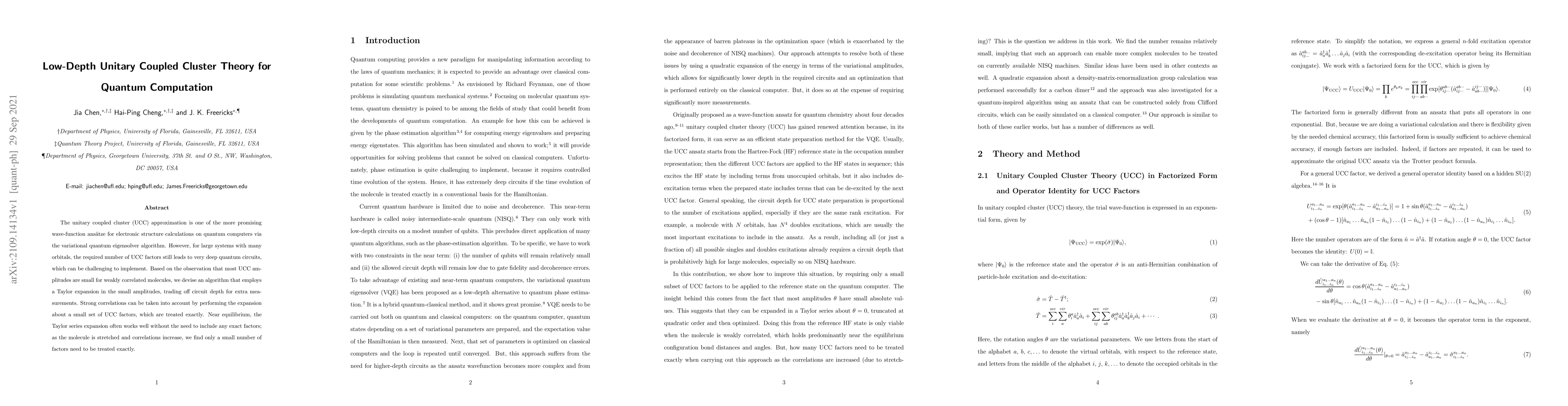 This paper proposes a low-depth unitary coupled cluster (UCC) approximation for quantum computation, utilizing a Taylor expansion of small UCC amplitudes to reduce circuit depth. Exact treatment of a few UCC factors is reserved for strong correlations, allowing efficient implementation on quantum computers.