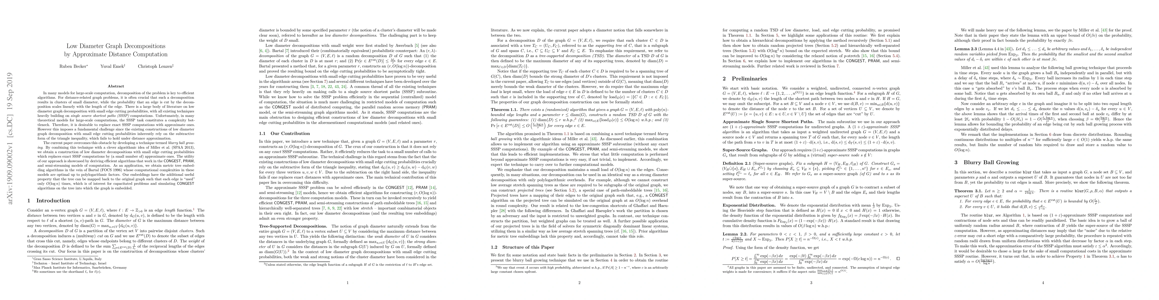 In many models for large-scale computation, decomposition of the problem is key to efficient algorithms. For distance-related graph problems, it is often crucial that such a decomposition results in clusters of small diameter, while the probability that an edge is cut by the decomposition scales linearly with the length of the edge. There is a large body of literature on low diameter graph decomposition with small edge cutting probabilities, with all existing techniques heavily building on single source shortest paths (SSSP) computations. Unfortunately, in many theoretical models for large-scale computations, the SSSP task constitutes a complexity bottleneck. Therefore, it is desirable to replace exact SSSP computations with approximate ones. However this imposes a fundamental challenge since the existing constructions of such decompositions inherently rely on the subtractive form of the triangle inequality. The current paper overcomes this obstacle by developing a technique termed blurry ball growing. By combining this technique with a clever algorithmic idea of Miller et al. (SPAA 13), we obtain a construction of low diameter decompositions with small edge cutting probabilities which replaces exact SSSP computations by (a small number of) approximate ones. The utility of our approach is showcased by deriving efficient algorithms that work in the Congest, PRAM, and semi-streaming models of computation. As an application, we obtain metric tree embedding algorithms in the vein of Bartal (FOCS 96) whose computational complexities in these models are optimal up to polylogarithmic factors. Our embeddings have the additional useful property that the tree can be mapped back to the original graph such that each edge is "used" only O(log n) times, which is of interest for capacitated problems and simulating Congest algorithms on the tree into which the graph is embedded.