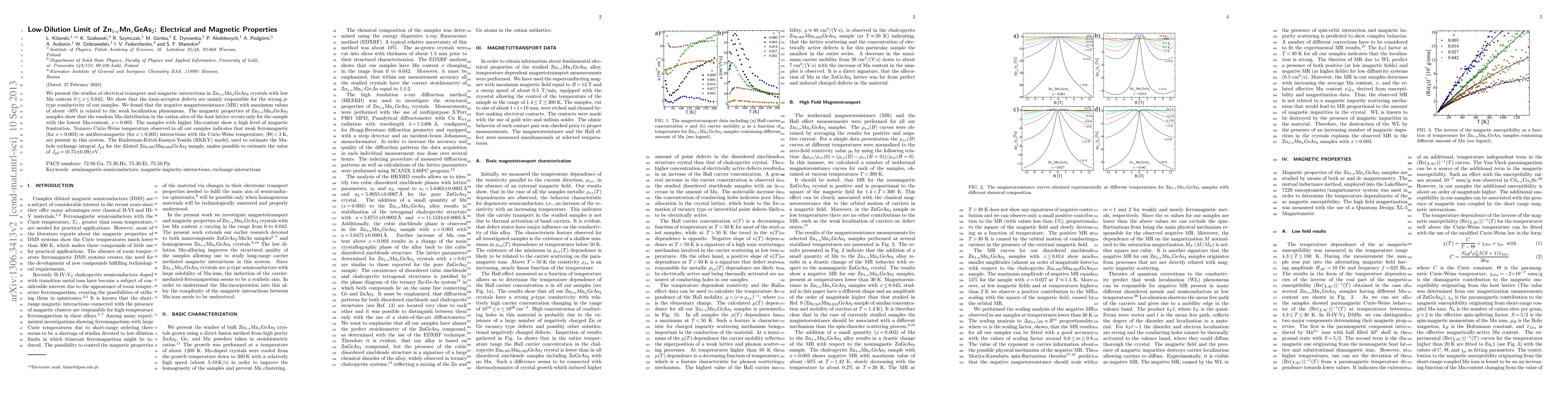 We present the studies of electrical transport and magnetic interactions in Zn_{1-x}Mn_{x}GeAs_{2} crystals with low Mn content 0 \leq x \leq 0.043. We show that the ionic-acceptor defects are mainly responsible for the strong p-type conductivity of our samples. We found that the negative magnetoresistance (MR) with maximum values of about -50% is related to the weak localization phenomena. The magnetic properties of Zn1-xMnxGeAs2 samples show that the random Mn-distribution in the cation sites of the host lattice occurs only for the sample with the lowest Mn-content, x=0.003. The samples with higher Mn-content show a high level of magnetic frustration. Nonzero Curie-Weiss temperature observed in all our samples indicates that weak ferromagnetic (for x=0.003) or antiferromagnetic (for x>0.005) interactions with |{\Theta}|<3 K are present in this system. The RKKY model, used to estimate the Mn-hole exchange integral Jpd for the diluted Zn/0.997/Mn/0.003/GeAs/2/ sample, makes possible to estimate the value of Jpd =(0.75+/-0.09) eV.