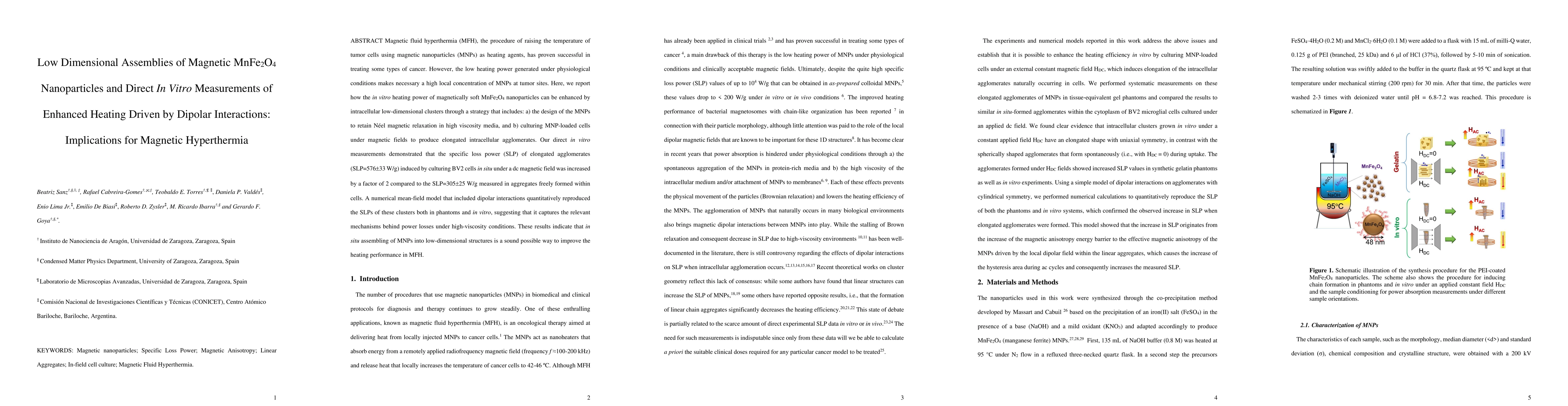 Magnetic fluid hyperthermia (MFH), the procedure of raising the temperature of tumor cells using magnetic nanoparticles (MNPs) as heating agents, has proven successful in treating some types of cancer. However, the low heating power generated under physiological conditions makes necessary a high local concentration of MNPs at tumor sites. Here, we report how the in vitro heating power of magnetically soft MnFe$_2$O$_4$ nanoparticles can be enhanced by intracellular low-dimensional clusters through a strategy that includes: a) the design of the MNPs to retain N\'eel magnetic relaxation in high viscosity media, and b) culturing MNP-loaded cells under magnetic fields to produce elongated intracellular agglomerates. Our direct in vitro measurements demonstrated that the specific loss power (SLP) of elongated agglomerates ($SLP=576\pm33$ W/g) induced by culturing BV2 cells in situ under a dc magnetic field was increased by a factor of 2 compared to the $SLP=305\pm25$ W/g measured in aggregates freely formed within cells. A numerical mean-field model that included dipolar interactions quantitatively reproduced the SLPs of these clusters both in phantoms and in vitro, suggesting that it captures the relevant mechanisms behind power losses under high-viscosity conditions. These results indicate that in situ assembling of MNPs into low-dimensional structures is a sound possible way to improve the heating performance in MFH.