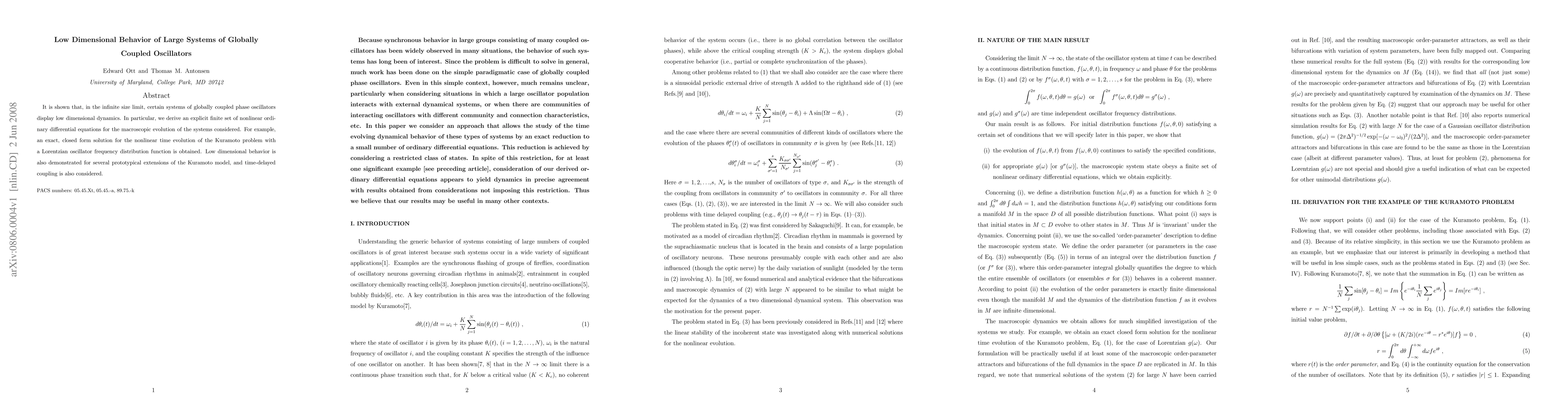 It is shown that, in the infinite size limit, certain systems of globally coupled phase oscillators display low dimensional dynamics. In particular, we derive an explicit finite set of nonlinear ordinary differential equations for the macroscopic evolution of the systems considered. For example, an exact, closed form solution for the nonlinear time evolution of the Kuramoto problem with a Lorentzian oscillator frequency distribution function is obtained. Low dimensional behavior is also demonstrated for several prototypical extensions of the Kuramoto model, and time-delayed coupling is also considered.
