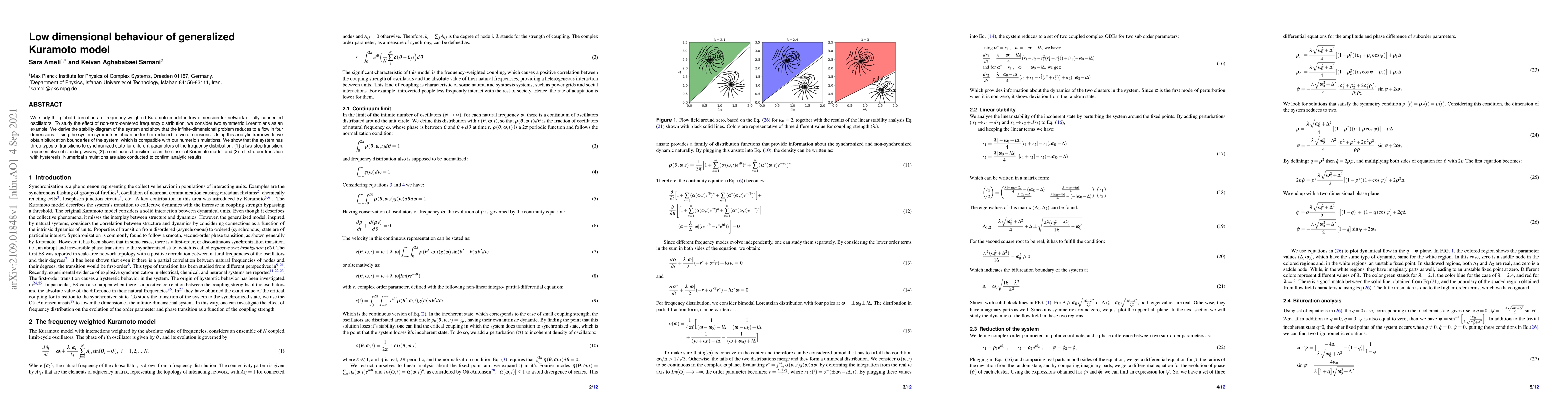We study the global bifurcations of frequency weighted Kuramoto model in low-dimension for network of fully connected oscillators. To study the effect of non-zero-centered frequency distribution, we consider two symmetric Lorentzians as an example. We derive the stability diagram of the system and show that the infinite-dimensional problem reduces to a flow in four dimensions. Using the system symmetries, it can be further reduced to two dimensions. Using this analytic framework, we obtain bifurcation boundaries of the system, which is compatible with our numeric simulations. We show that the system has three types of transitions to synchronized state for different parameters of the frequency distribution: (1) a two-step transition, representative of standing waves, (2) a continuous transition, as in the classical Kuramoto model, and (3) a first-order transition with hysteresis. Numerical simulations are also conducted to confirm analytic results.