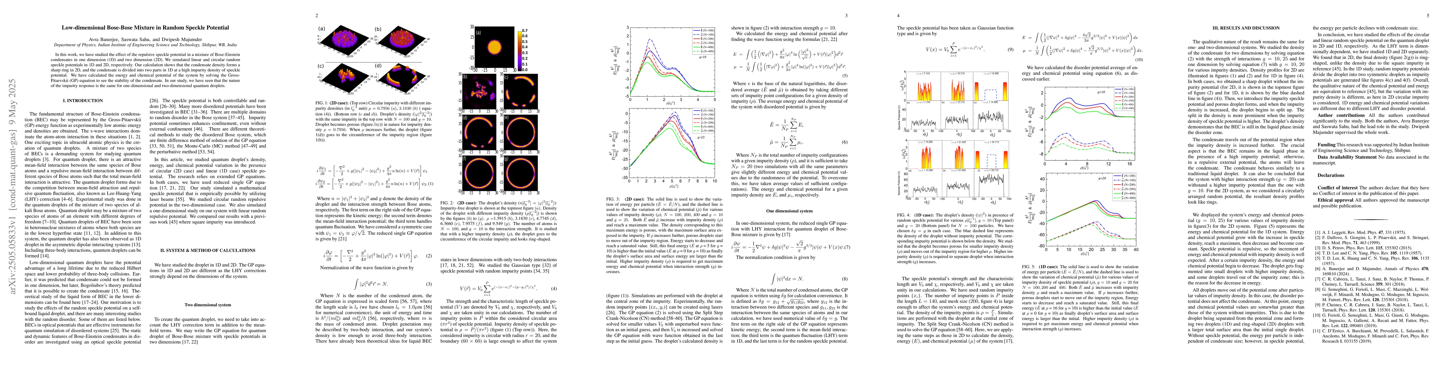 The research methodology involved simulating linear and circular random speckle potentials in 1D and 2D, respectively, to study the effect of repulsive speckle potential on a mixture of Bose-Einstein condensates. The Gross-Pitaevskii (GP) equation was solved to calculate the energy and chemical potential, ensuring the stability of the condensate.