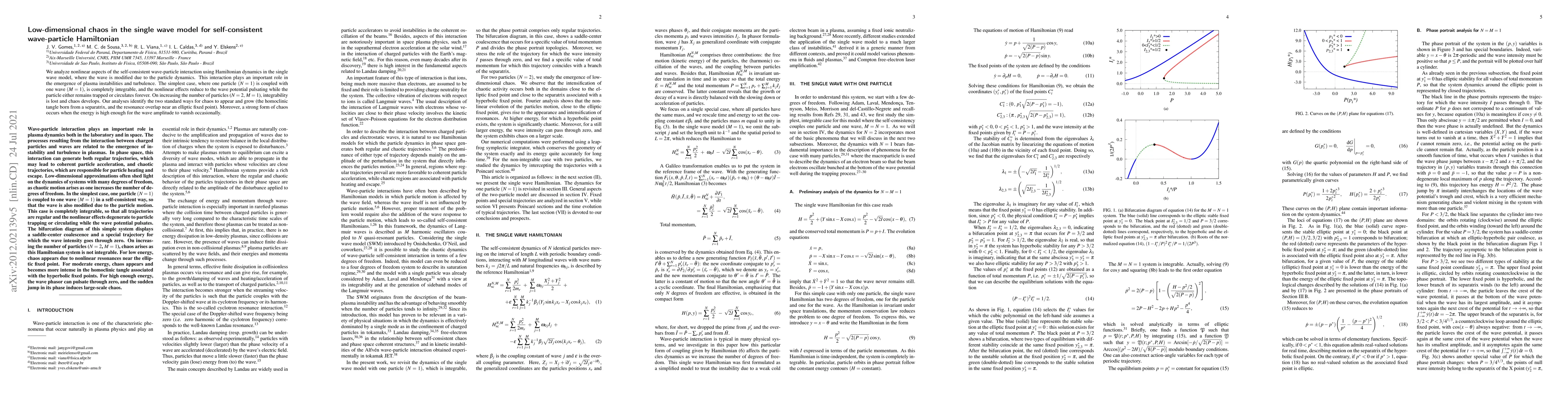 Researchers analyze chaos in a single wave model for self-consistent wave-particle interaction, finding two types of chaotic behavior that emerge as the number of particles increases, including homoclinic tangles and resonance overlaps.