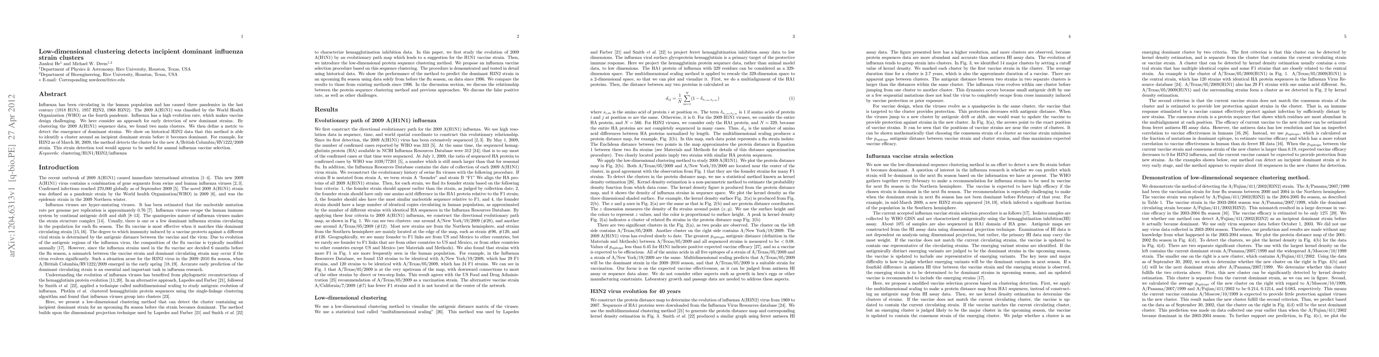 This research proposes a low-dimensional clustering method to detect emerging dominant influenza strains early. The method successfully identifies clusters within the 2009 A(H1N1) data and can predict the rise of new dominant strains, as demonstrated by its ability to foresee the emergence of the A/British Columbia/RV1222/2009 strain in historical H3N2 data.