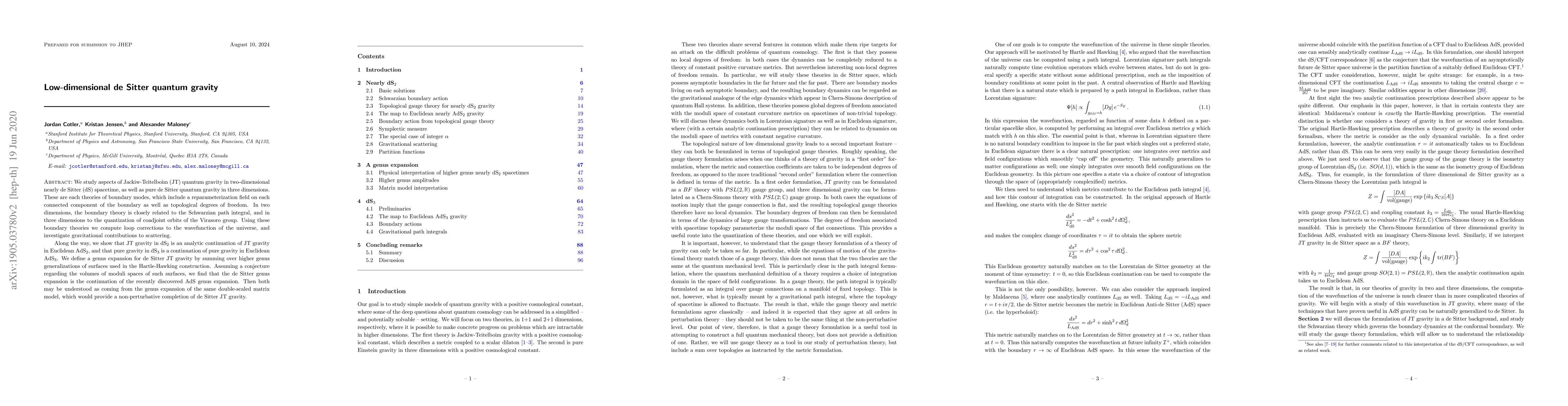 We study aspects of Jackiw-Teitelboim (JT) quantum gravity in two-dimensional nearly de Sitter (dS) spacetime, as well as pure de Sitter quantum gravity in three dimensions. These are each theories of boundary modes, which include a reparameterization field on each connected component of the boundary as well as topological degrees of freedom. In two dimensions, the boundary theory is closely related to the Schwarzian path integral, and in three dimensions to the quantization of coadjoint orbits of the Virasoro group. Using these boundary theories we compute loop corrections to the wavefunction of the universe, and investigate gravitational contributions to scattering. Along the way, we show that JT gravity in dS$_2$ is an analytic continuation of JT gravity in Euclidean AdS$_2$, and that pure gravity in dS$_3$ is a continuation of pure gravity in Euclidean AdS$_3$. We define a genus expansion for de Sitter JT gravity by summing over higher genus generalizations of surfaces used in the Hartle-Hawking construction. Assuming a conjecture regarding the volumes of moduli spaces of such surfaces, we find that the de Sitter genus expansion is the continuation of the recently discovered AdS genus expansion. Then both may be understood as coming from the genus expansion of the same double-scaled matrix model, which would provide a non-perturbative completion of de Sitter JT gravity.
