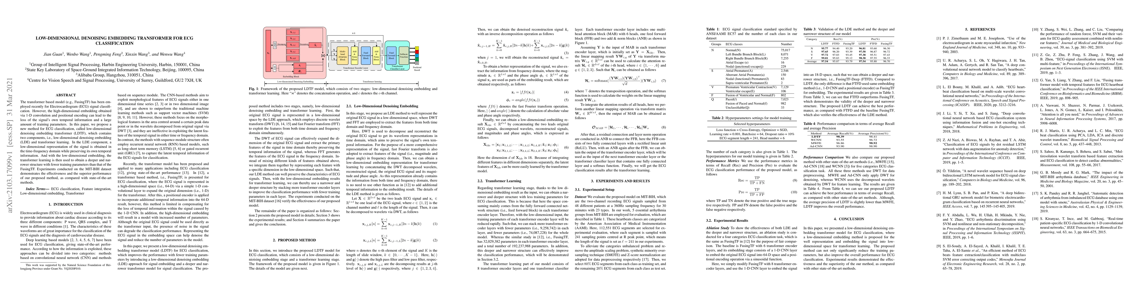 This paper proposes a low-dimensional denoising embedding transformer (LDTF) for ECG classification, combining low-dimensional denoising embedding (LDE) to preserve temporal information and a transformer to reduce training parameters. Experiments show superior performance compared to state-of-the-art methods on the MIT-BIH dataset.