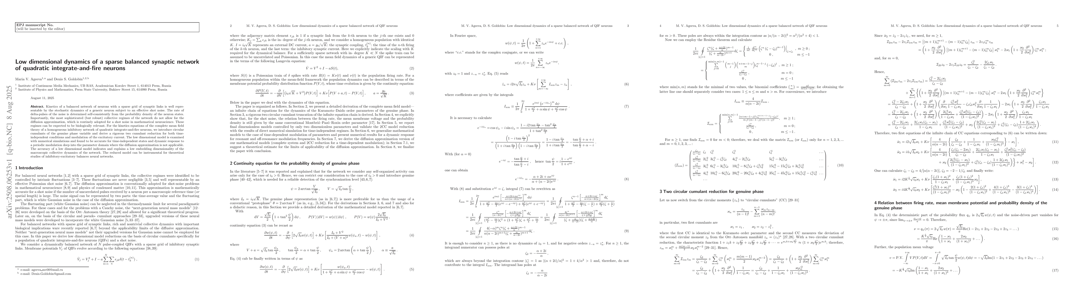 The research derives a low-dimensional neural mass model for sparse balanced networks of neurons driven by effective synaptic shot noise, using circular cumulant formalism and a two-cumulant truncation.