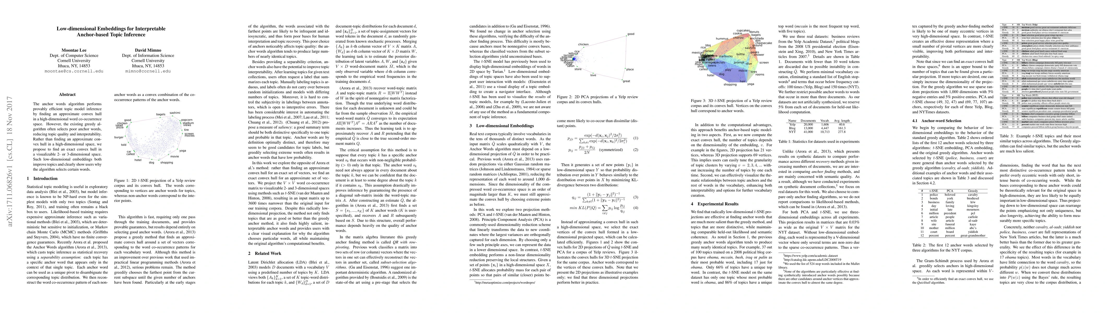 The anchor words algorithm performs provably efficient topic model inference by finding an approximate convex hull in a high-dimensional word co-occurrence space. However, the existing greedy algorithm often selects poor anchor words, reducing topic quality and interpretability. Rather than finding an approximate convex hull in a high-dimensional space, we propose to find an exact convex hull in a visualizable 2- or 3-dimensional space. Such low-dimensional embeddings both improve topics and clearly show users why the algorithm selects certain words.
