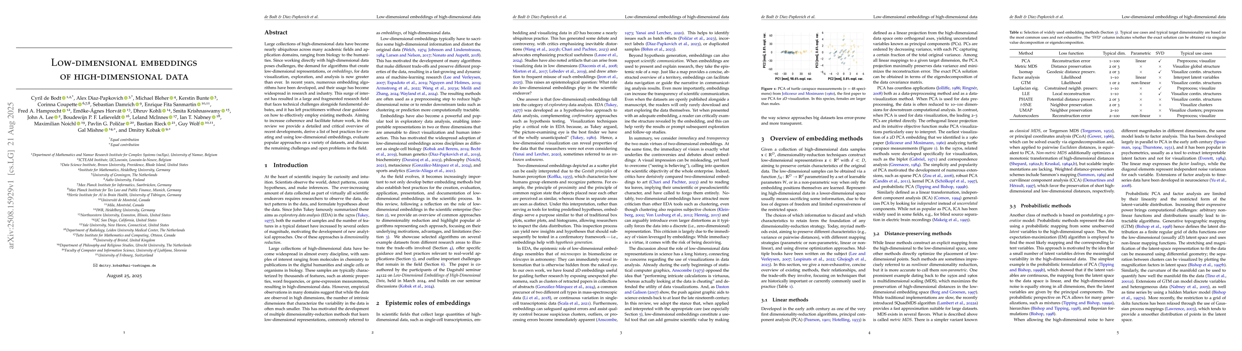 Large collections of high-dimensional data have become nearly ubiquitous across many academic fields and application domains, ranging from biology to the humanities. Since working directly with high-dimensional data poses challenges, the demand for algorithms that create low-dimensional representations, or embeddings, for data visualization, exploration, and analysis is now greater than ever. In recent years, numerous embedding algorithms have been developed, and their usage has become widespread in research and industry. This surge of interest has resulted in a large and fragmented research field that faces technical challenges alongside fundamental debates, and it has left practitioners without clear guidance on how to effectively employ existing methods. Aiming to increase coherence and facilitate future work, in this review we provide a detailed and critical overview of recent developments, derive a list of best practices for creating and using low-dimensional embeddings, evaluate popular approaches on a variety of datasets, and discuss the remaining challenges and open problems in the field.