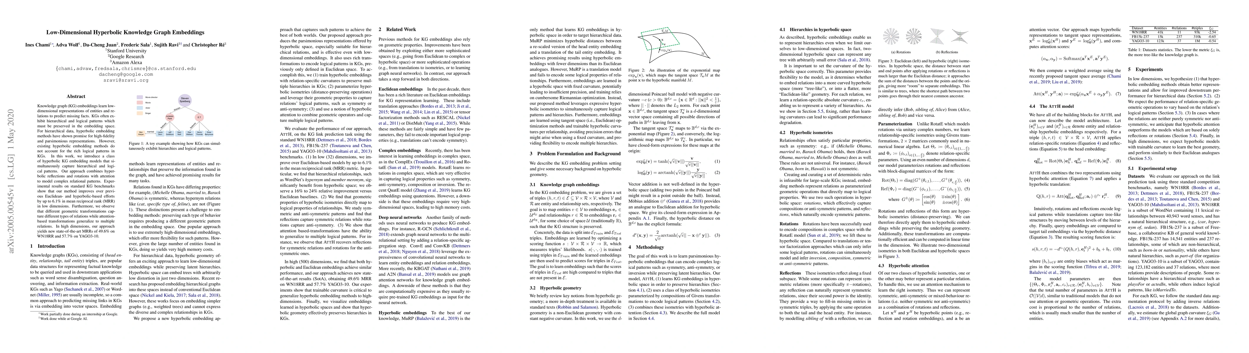 This paper proposes hyperbolic knowledge graph embedding models that integrate hyperbolic reflections and rotations with attention mechanisms to capture both hierarchical and logical patterns in KGs. Experimental results demonstrate significant improvements over previous methods, achieving state-of-the-art performance on standard benchmarks.