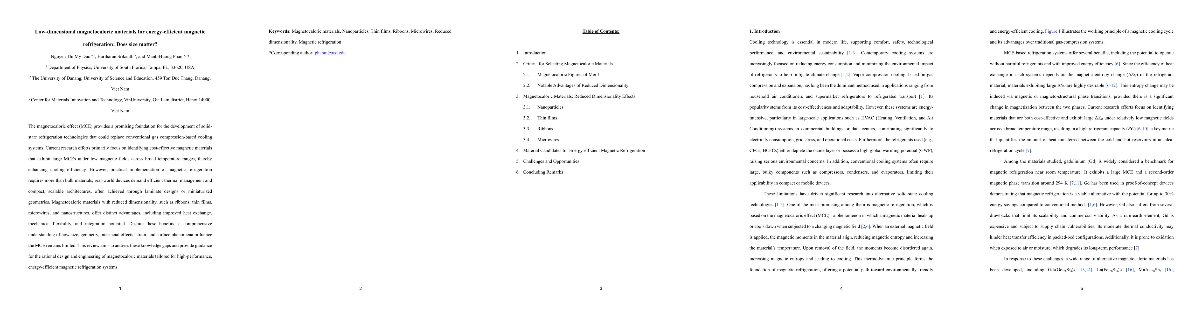 The paper provides a comprehensive review of low-dimensional magnetocaloric materials, highlighting their advantages and identifying knowledge gaps for future research.