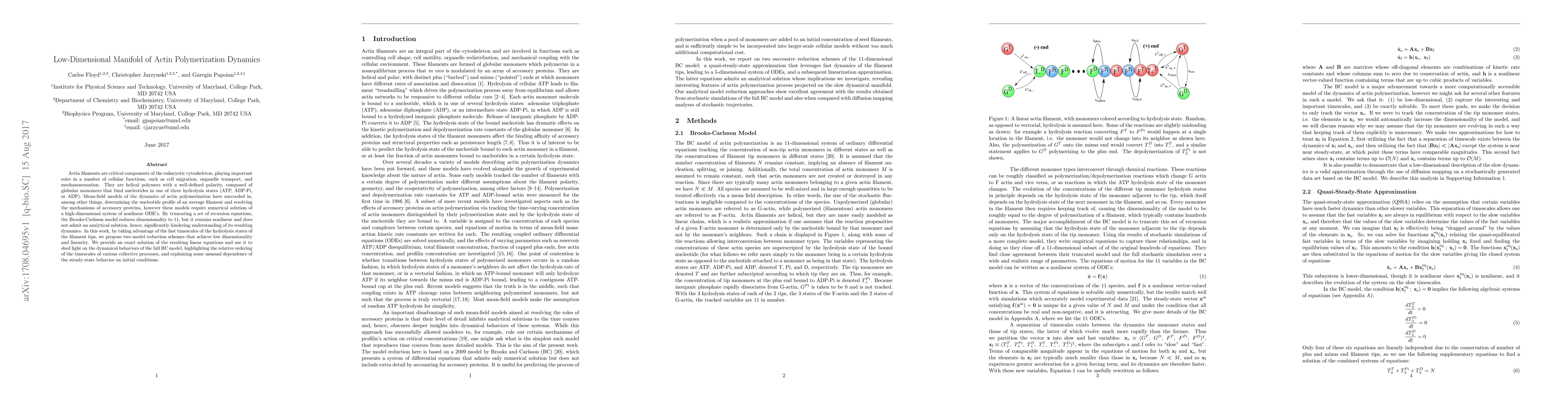 This paper proposes two linear model reduction schemes to simplify the dynamics of actin polymerization, achieving low dimensionality and analytical solutions. The exact solutions reveal the relative ordering of timescales and explain the unusual dependence of steady-state behavior on initial conditions.