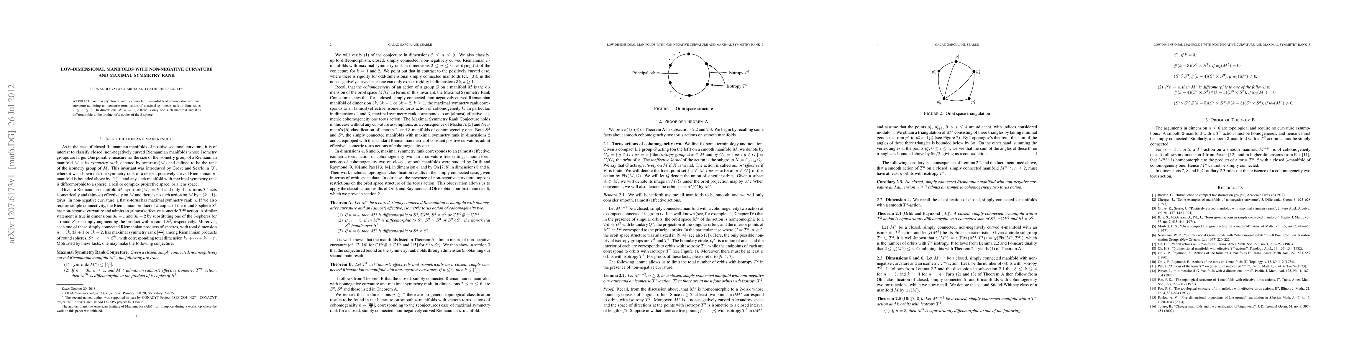 This paper classifies closed, simply connected $n$-manifolds with non-negative sectional curvature that allow an isometric torus action of maximal symmetry rank in dimensions $2\leq n\leq 6$. It finds that in dimensions $3k$, $k=1,2$, there is a unique such manifold, which is diffeomorphic to the product of $k$ copies of the 3-sphere.