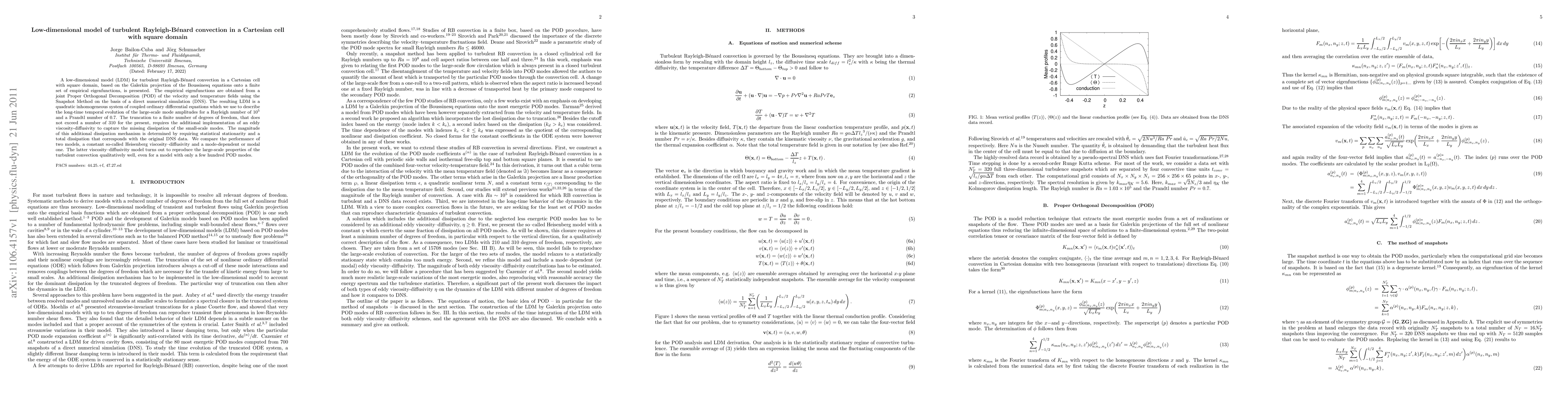 A low-dimensional model (LDM) for turbulent Rayleigh-Benard convection in a Cartesian cell with square domain, based on the Galerkin projection of the Boussinesq equations onto a finite set of empirical eigenfunctions, is presented. The empirical eigenfunctions are obtained from a joint Proper Orthogonal Decomposition (POD) of the velocity and temperature fields using the Snapshot Method on the basis of a direct numerical simulation (DNS). The resulting LDM is a quadratic inhomogeneous system of coupled ordinary differential equations which we use to describe the long-time temporal evolution of the large-scale mode amplitudes for a Rayleigh number of 1e5 and a Prandtl number of 0.7. The truncation to a finite number of degrees of freedom, that does not exceed a number of 310 for the present, requires the additional implementation of an eddy viscosity-diffusivity to capture the missing dissipation of the small-scale modes. The magnitude of this additional dissipation mechanism is determined by requiring statistical stationarity and a total dissipation that corresponds with the original DNS data. We compare the performance of two models, a constant so-called Heisenberg viscosity--diffusivity and a mode-dependent or modal one. The latter viscosity--diffusivity model turns out to reproduce the large-scale properties of the turbulent convection qualitatively well, even for a model with only a few hundred POD modes.