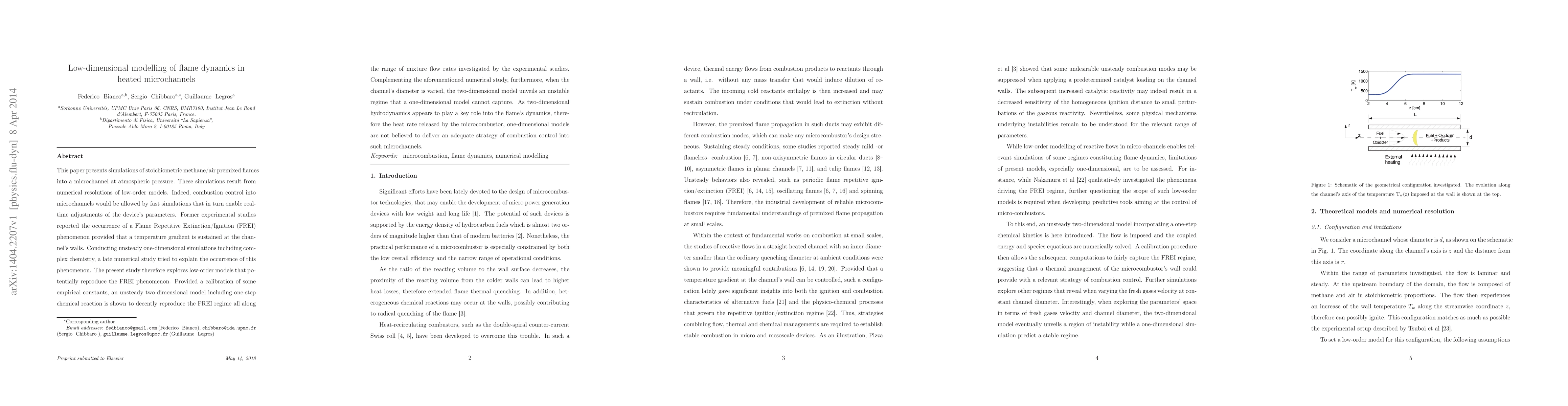 This paper presents simulations of stoichiometric methane/air premixed flames into a microchannel at atmospheric pressure. These simulations result from numerical resolutions of reduced-order models. Indeed, combustion control into microchannels would be allowed by fast simulations that in turn enable real-time adjustments of the device's parameters. Former experimental studies reported the occurrence of a Flame Repetitive Extinction/Ignition (FREI) phenomenon provided that a temperature gradient is sustained at the channel's walls. Conducting unsteady one-dimensional simulations including complex chemistry, a late numerical study tried to explain the occurrence of this phenomenon. The present study therefore explores low-dimensional models that potentially reproduce the FREI phenomenon. Provided a calibration of some empirical constants, an unsteady two-dimensional model including one-step chemical reaction is shown to decently reproduce the FREI regime all along the range of mixture flow rates investigated by the experimental studies. Complementing the aforementioned numerical study, furthermore, when the channel's diameter is varied, the two-dimensional model unveils an unstable regime that a one-dimensional model cannot capture. As two-dimensional hydrodynamics appears to play a key role into the flame's dynamics, therefore the heat rate released by the microcombustor, one-dimensional models are not believed to deliver an adequate strategy of combustion control into such microchannels.