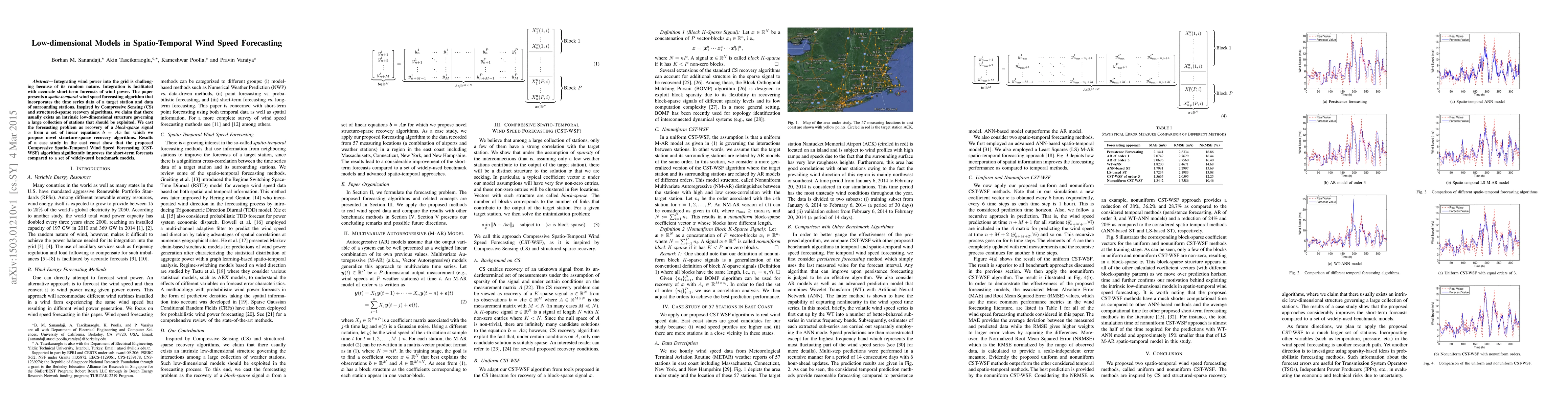 This paper proposes a novel spatio-temporal wind speed forecasting algorithm leveraging Compressive Sensing to exploit low-dimensional structures in wind data from multiple stations. The Compressive Spatio-Temporal Wind Speed Forecasting (CST-WSF) algorithm significantly outperforms benchmark models in short-term wind speed predictions, as demonstrated by a case study on the east coast.