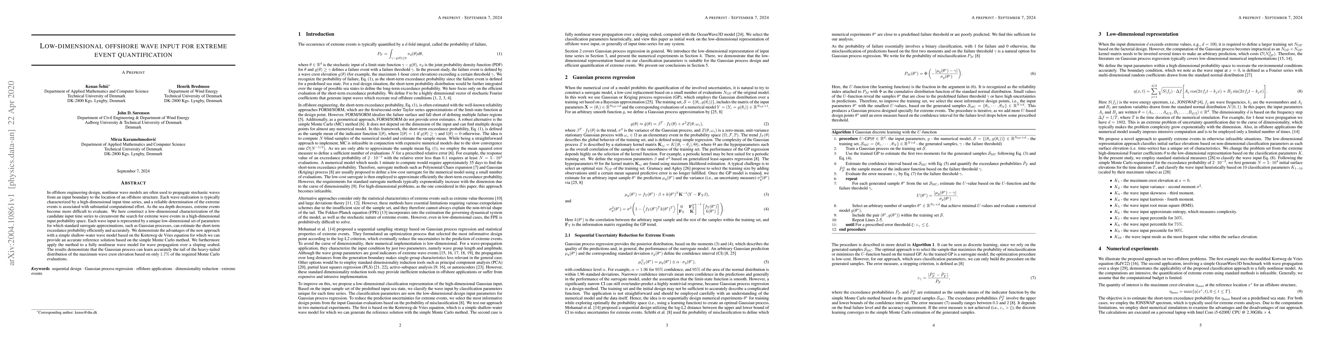 This paper proposes a low-dimensional characterization to efficiently estimate extreme wave events in offshore engineering design, reducing computational effort by using Gaussian processes. The method is applied to both shallow-water and fully nonlinear wave models, showing significant efficiency gains over traditional Monte Carlo simulations.