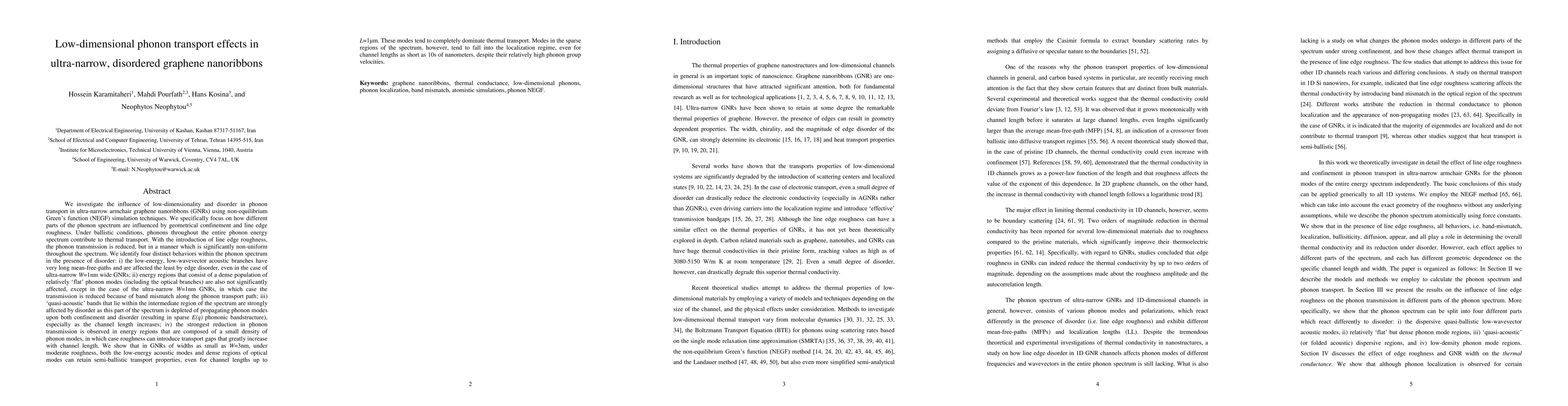 We investigate the influence of low-dimensionality and disorder in phonon transport in ultra-narrow armchair graphene nanoribbons (GNRs) using non-equilibrium Greens function (NEGF) simulation techniques. We specifically focus on how different parts of the phonon spectrum are influenced by geometrical confinement and line edge roughness. With the introduction of line edge roughness, the phonon transmission is reduced, but non-uniformly throughout the spectrum. We identify four distinct behaviors within the phonon spectrum in the presence of disorder: i) the low-energy, low-wavevector acoustic branches have very long mean-free-paths and are affected the least by edge disorder, even in the case of ultra-narrow W=1nm wide GNRs; ii) energy regions that consist of a dense population of relatively flat phonon modes (including the optical branches) are also not significantly affected, except in the case of the ultranarrow W=1nm GNRs, in which case the transmission is reduced because of band mismatch along the phonon transport path; iii) quasi-acoustic bands that lie within the intermediate region of the spectrum are strongly affected by disorder as this part of the spectrum is depleted of propagating phonon modes upon both confinement and disorder especially as the channel length increases; iv) the strongest reduction in phonon transmission is observed in energy regions that are composed of a small density of phonon modes, in which case roughness can introduce transport gaps that greatly increase with channel length. We show that in GNRs of widths as small as W=3nm, under moderate roughness, both the low-energy acoustic modes and dense regions of optical modes can retain semi-ballistic transport properties, even for channel lengths up to L=1 um. Modes in the sparse regions of the spectrum fall into the localization regime even for channel lengths as short as 10s of nanometers.