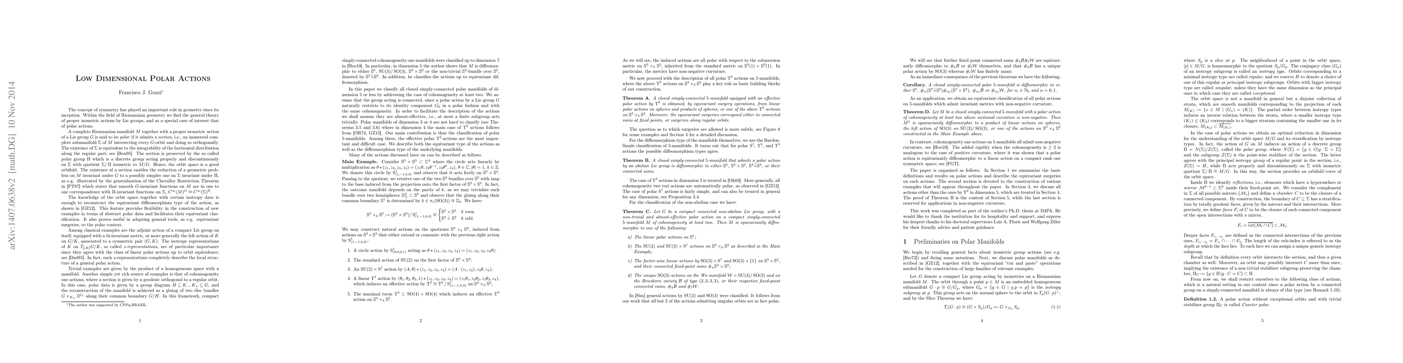 The paper achieves an equivariantly diffeomorphic classification of compact simply-connected polar manifolds in dimensions 5 or less, using Coxeter polar data and analyzing the actions of compact connected Lie groups.