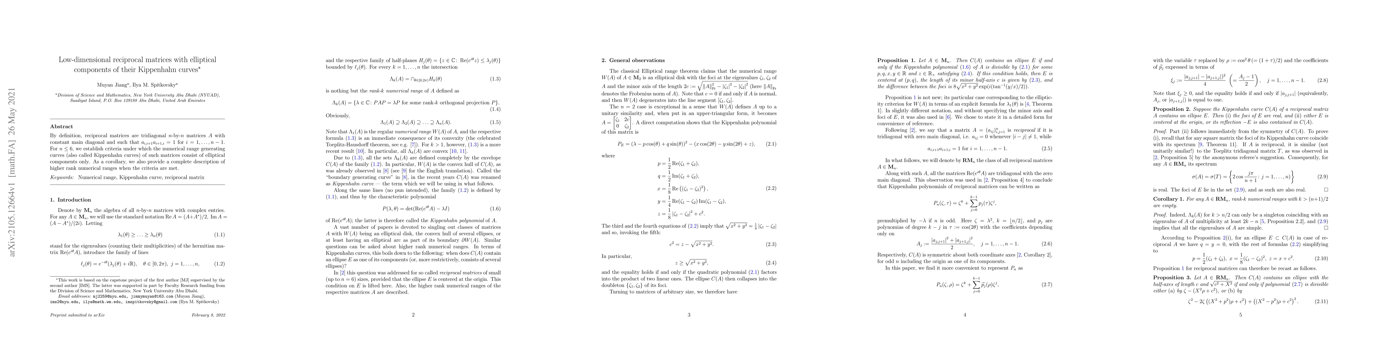 By definition, reciprocal matrices are tridiagonal $n$-by-$n$ matrices $A$ with constant main diagonal and such that $a_{i,i+1}a_{i+1,i}=1$ for $i=1,\ldots,n-1$. For $n\leq 6$, we establish criteria under which the numerical range generating curves (also called Kippenhahn curves) of such matrices consist of elliptical components only. As a corollary, we also provide a complete description of higher-rank numerical ranges when the criteria are met.