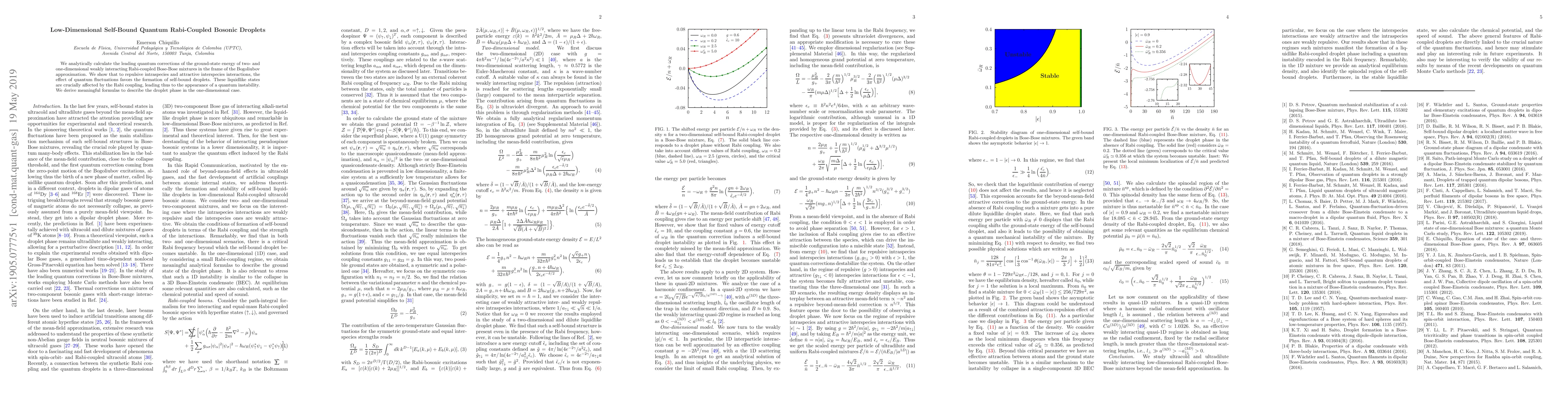 This paper analytically investigates the ground-state energy of weakly interacting Rabi-coupled Bose-Bose mixtures, revealing that quantum fluctuations favor the formation of self-bound droplets in one and two dimensions. The study highlights the impact of Rabi coupling on these liquidlike states, leading to a quantum instability.