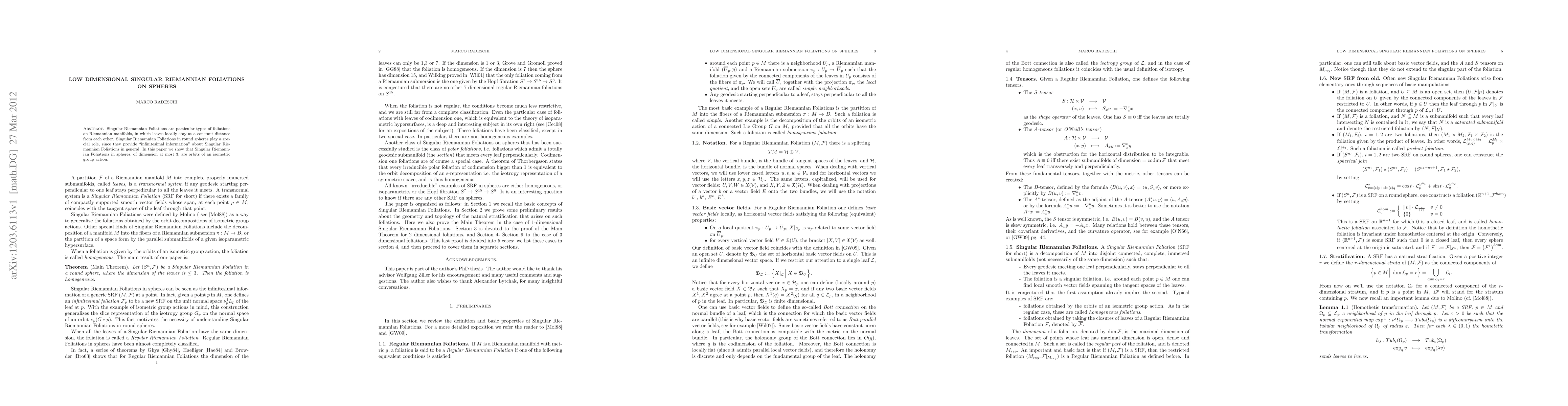 This paper investigates Singular Riemannian Foliations in round spheres, particularly those of dimension at most 3, demonstrating that they are orbits of an isometric group action. These foliations provide insight into the general properties of such structures.