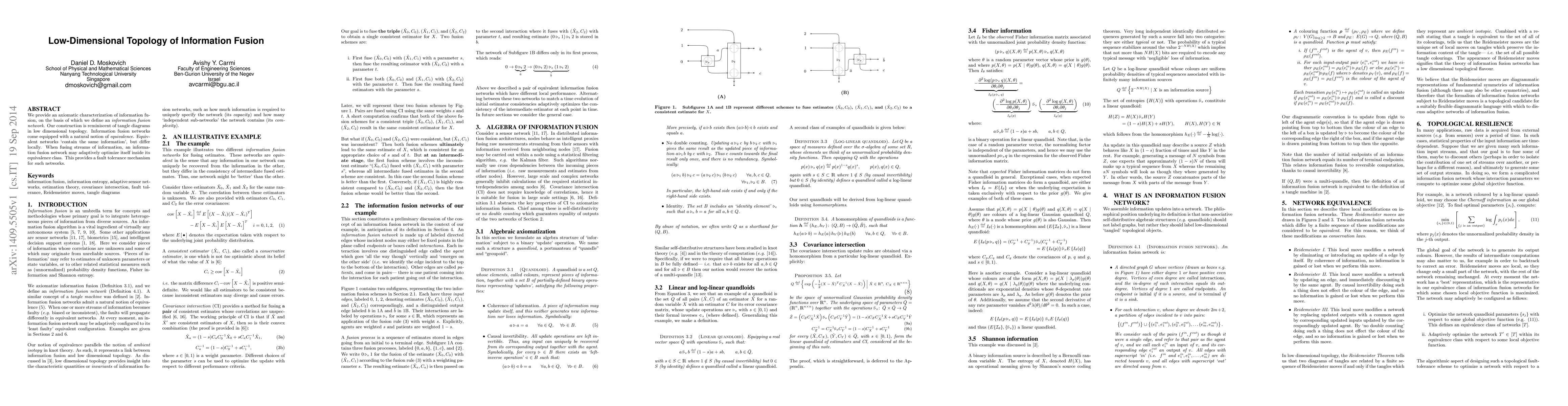 We provide an axiomatic characterization of information fusion, on the basis of which we define an information fusion network. Our construction is reminiscent of tangle diagrams in low dimensional topology. Information fusion networks come equipped with a natural notion of equivalence. Equivalent networks `contain the same information', but differ locally. When fusing streams of information, an information fusion network may adaptively optimize itself inside its equivalence class. This provides a fault tolerance mechanism for such networks.