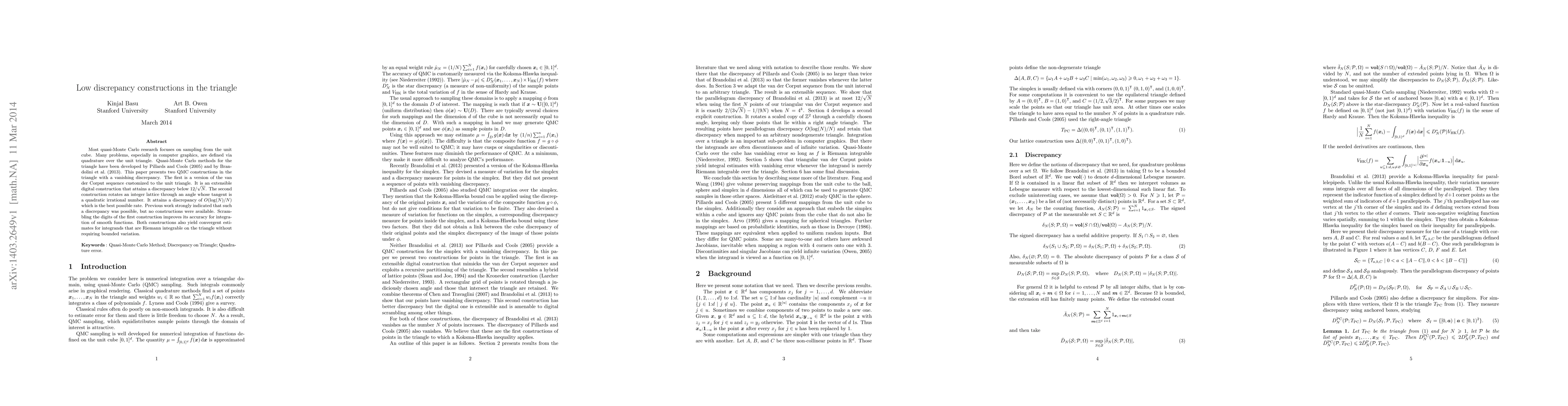 Most quasi-Monte Carlo research focuses on sampling from the unit cube. Many problems, especially in computer graphics, are defined via quadrature over the unit triangle. Quasi-Monte Carlo methods for the triangle have been developed by Pillands and Cools (2005) and by Brandolini et al. (2013). This paper presents two QMC constructions in the triangle with a vanishing discrepancy. The first is a version of the van der Corput sequence customized to the unit triangle. It is an extensible digital construction that attains a discrepancy below 12/sqrt(N). The second construction rotates an integer lattice through an angle whose tangent is a quadratic irrational number. It attains a discrepancy of O(log(N)/N) which is the best possible rate. Previous work strongly indicated that such a discrepancy was possible, but no constructions were available. Scrambling the digits of the first construction improves its accuracy for integration of smooth functions. Both constructions also yield convergent estimates for integrands that are Riemann integrable on the triangle without requiring bounded variation.