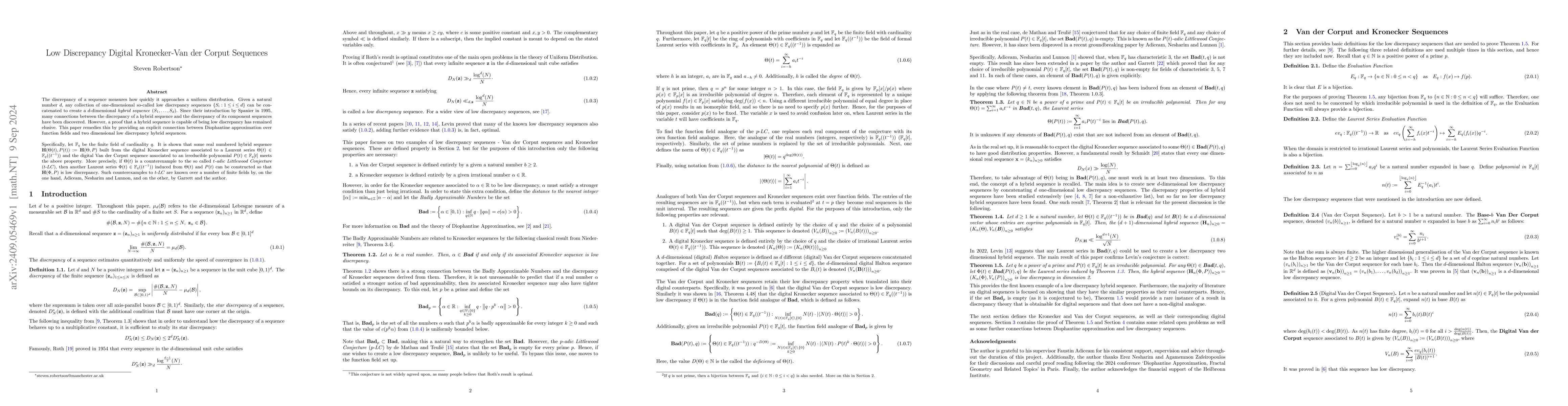 This paper establishes a proof that hybrid sequences constructed from low discrepancy digital Kronecker and Van der Corput sequences can achieve low discrepancy properties, leveraging connections between Diophantine approximation and function fields. Specifically, it shows that if certain counterexamples to the t-adic Littlewood Conjecture exist, alternative sequences can be formed to ensure the resulting hybrid sequence is low discrepancy.