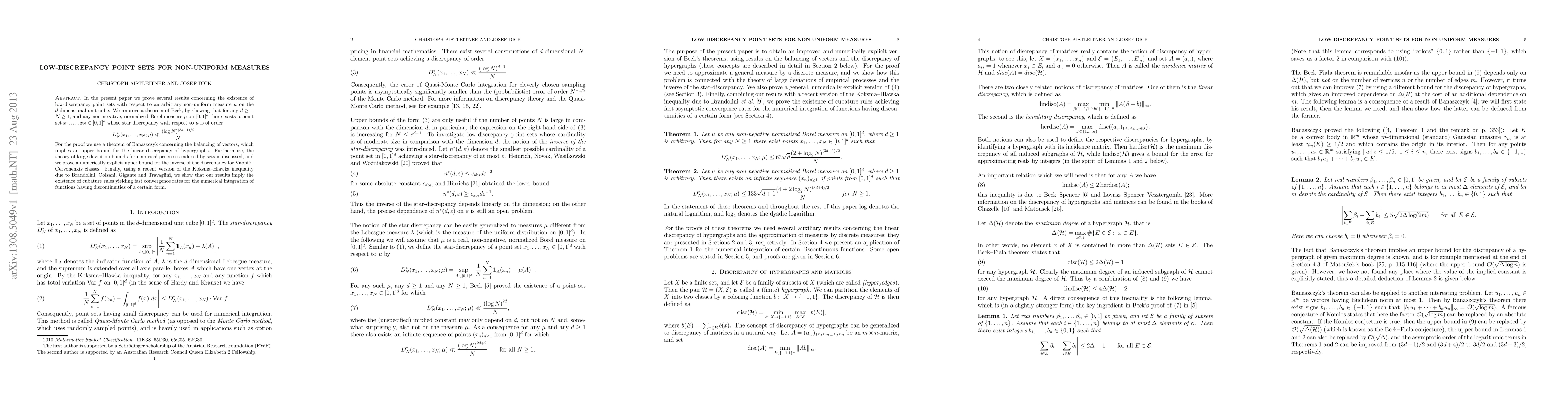 In the present paper we prove several results concerning the existence of low-discrepancy point sets with respect to an arbitrary non-uniform measure $\mu$ on the $d$-dimensional unit cube. We improve a theorem of Beck, by showing that for any $d \geq 1$, $N \geq 1,$ and any non-negative, normalized Borel measure $\mu$ on $[0,1]^d$ there exists a point set $x_1, \dots, x_N \in [0,1]^d$ whose star-discrepancy with respect to $\mu$ is of order $$ D_N^*(x_1, \dots, x_N; \mu) \ll \frac{(\log N)^{(3d+1)/2}}{N}. $$ For the proof we use a theorem of Banaszczyk concerning the balancing of vectors, which implies an upper bound for the linear discrepancy of hypergraphs. Furthermore, the theory of large deviation bounds for empirical processes indexed by sets is discussed, and we prove a numerically explicit upper bound for the inverse of the discrepancy for Vapnik--\v{C}ervonenkis classes. Finally, using a recent version of the Koksma--Hlawka inequality due to Brandolini, Colzani, Gigante and Travaglini, we show that our results imply the existence of cubature rules yielding fast convergence rates for the numerical integration of functions having discontinuities of a certain form.