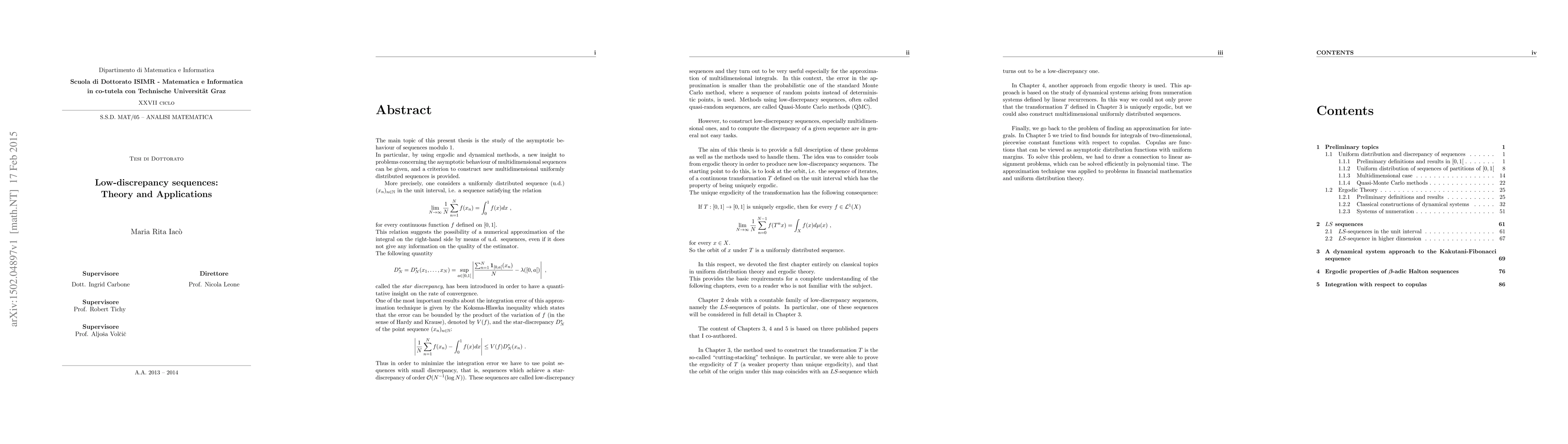 The main topic of this present thesis is the study of the asymptotic behaviour of sequences modulo 1. In particular, by using ergodic and dynamical methods, a new insight to problems concerning the asymptotic behaviour of multidimensional sequences can be given, and a criterion to construct new multidimensional uniformly distributed sequences is provided. The starting point to do this, is to look at the orbit, i.e. the sequence of iterates, of a uniquely ergodic transformation T defined on [0,1]. The unique ergodicity of the transformation has the following consequence: the orbit of x under T is a uniformly distributed sequence. We devoted the first chapter entirely on classical topics in uniform distribution theory (UDT) and ergodic theory. This provides the basic requirements for a complete understanding of the following chapters, even to a reader who is not familiar with the subject. Chapter 2 deals with the LS-sequences of points. In Chapter 3, the method used to construct the transformation T is the so-called cutting-stacking technique. In particular, we were able to prove the ergodicity of T and that the orbit of the origin under this map coincides with an LS-sequence which turns out to be a low-discrepancy one. In Chapter 4, another approach from ergodic theory is used. This approach is based on the study of dynamical systems arising from numeration systems defined by linear recurrences. In this way we could not only prove that the transformation T defined in Chapter 3 is uniquely ergodic, but we could also construct multidimensional uniformly distributed sequences. In Chapter 5 we found bounds for integrals of two-dimensional, piecewise constant functions with respect to copulas. To solve this problem, we drew a connection to linear assignment problems. The approximation technique was applied to problems in financial mathematics and UDT.