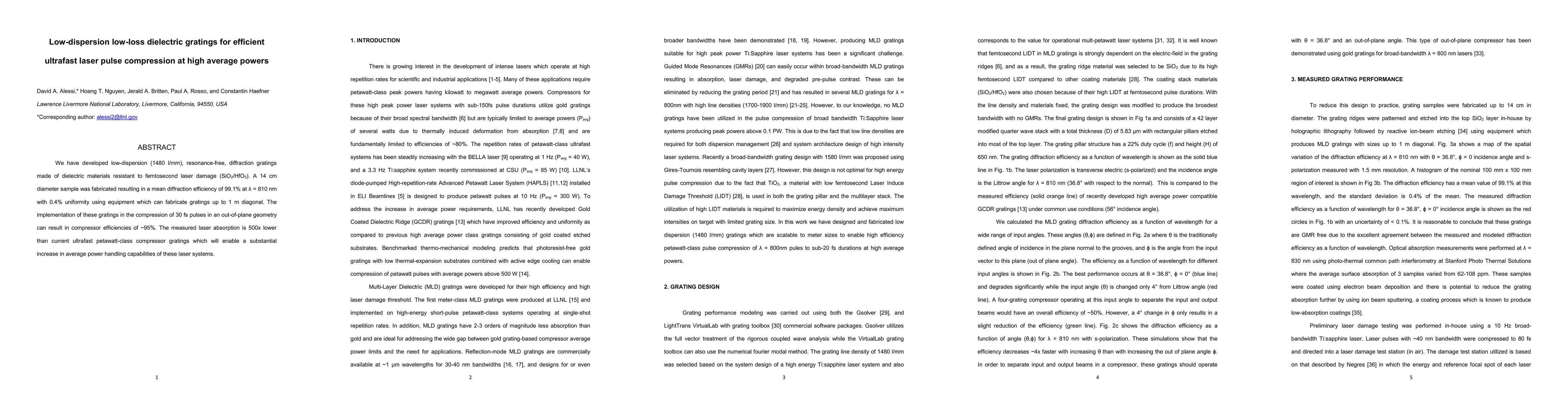 This paper presents the development of low-dispersion, resonance-free dielectric gratings made from $SiO_{2}/HfO_{2}$ for efficient ultrafast laser pulse compression, achieving high average power handling with a 14 cm diameter sample and a mean diffraction efficiency of 99.1%. The new gratings offer significantly lower laser absorption compared to existing petawatt-class compressors.