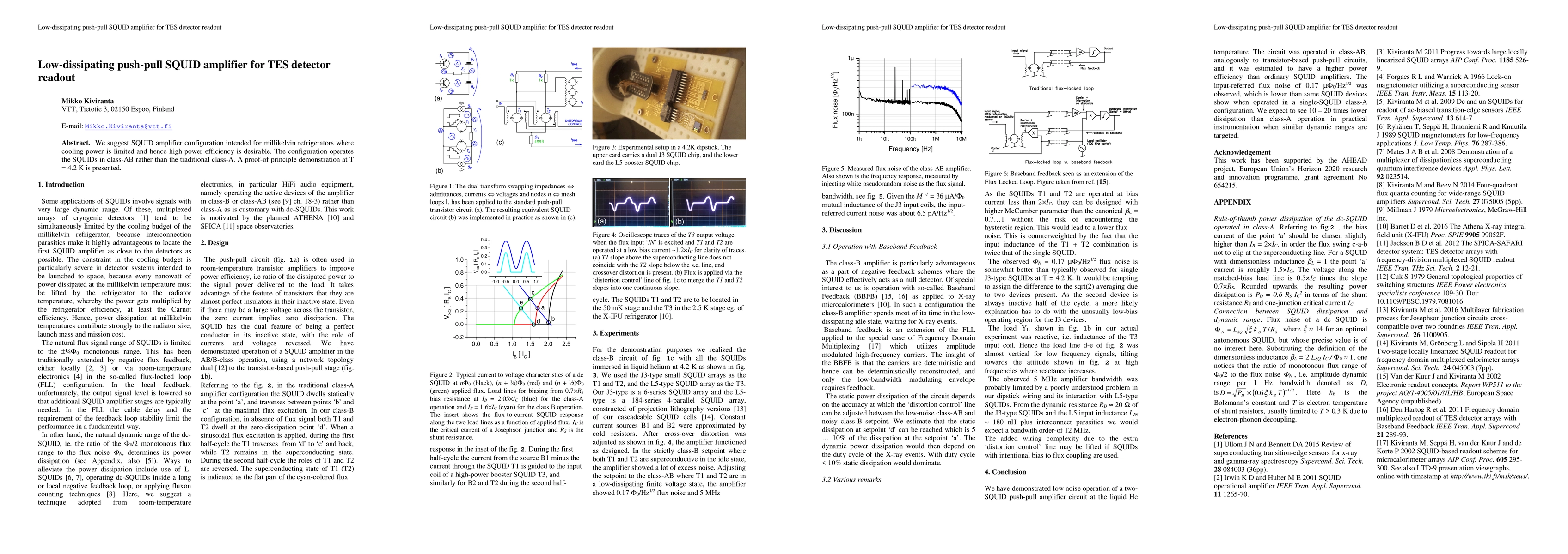 This paper proposes a low-dissipating push-pull SQUID amplifier designed for efficient operation in millikelvin refrigerators, utilizing class-AB SQUIDs to enhance power efficiency. A proof-of-concept demonstration at 4.2 K validates the configuration's effectiveness.