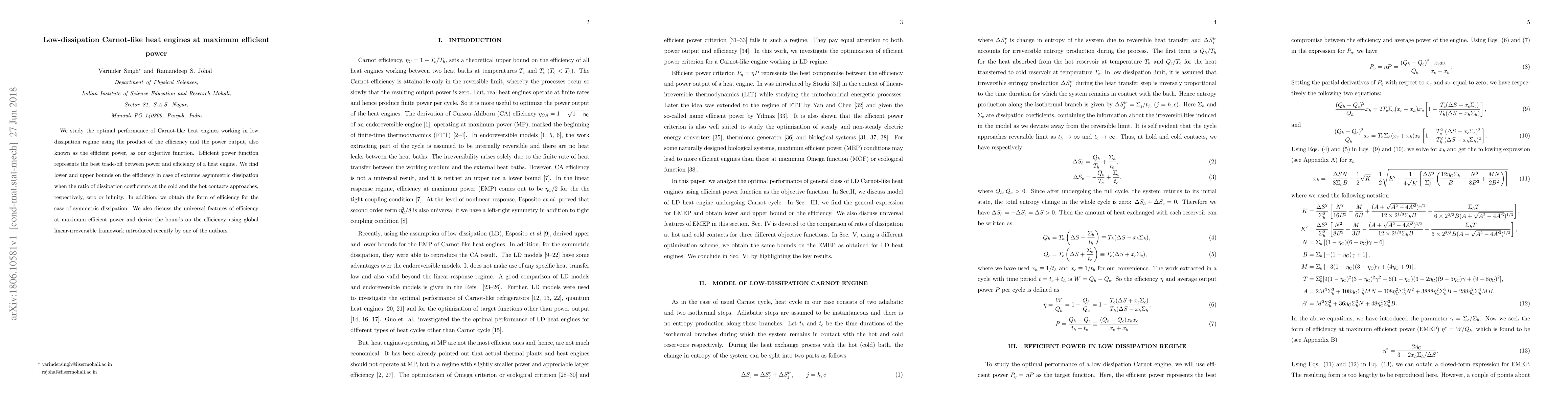 This paper investigates the optimal performance of Carnot-like heat engines operating under low dissipation conditions, focusing on maximizing the efficient power. It establishes bounds on efficiency for extreme asymmetric dissipation scenarios and derives the efficiency form for symmetric dissipation, highlighting universal features and employing a global linear-irreversible framework.