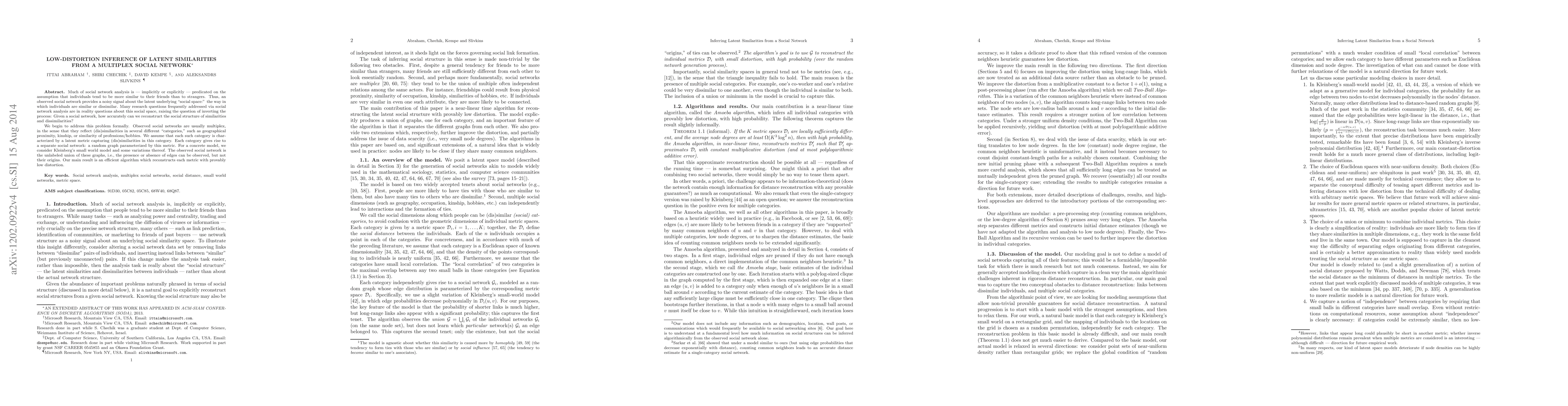 This paper introduces a method to infer latent similarities from a multiplex social network, which combines various categories like geographical proximity or shared interests. The proposed algorithm reconstructs each category's metric with provably low distortion, even when the origin of edges is unknown.