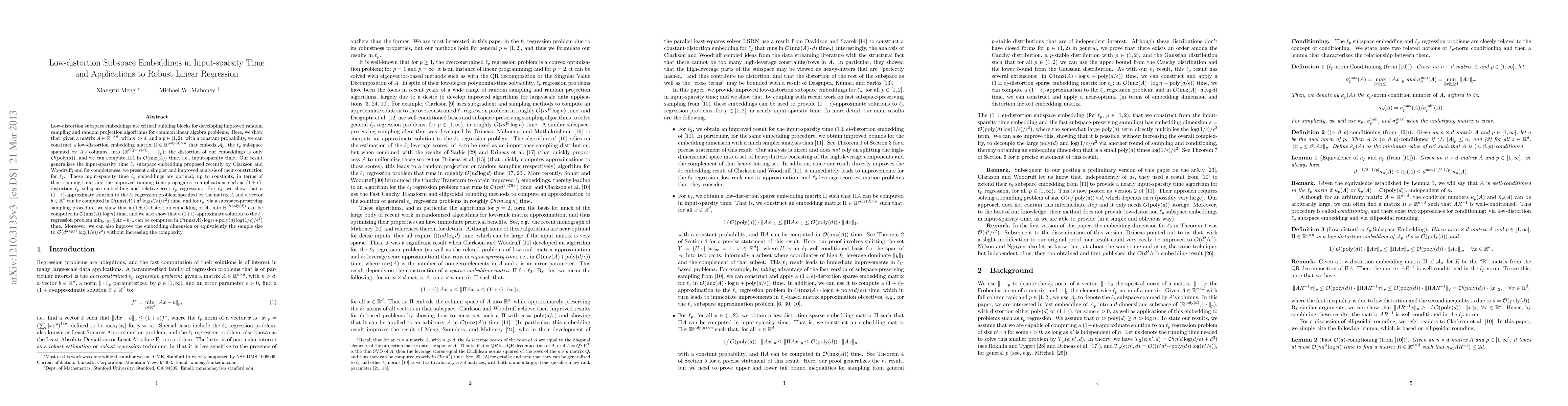 This paper presents a method for constructing low-distortion subspace embeddings in input-sparsity time, applicable to $\ell_p$ norms for $p \in [1,2)$. The embeddings enable efficient computation of approximate solutions for robust linear regression problems, achieving optimal running times relative to the input sparsity.