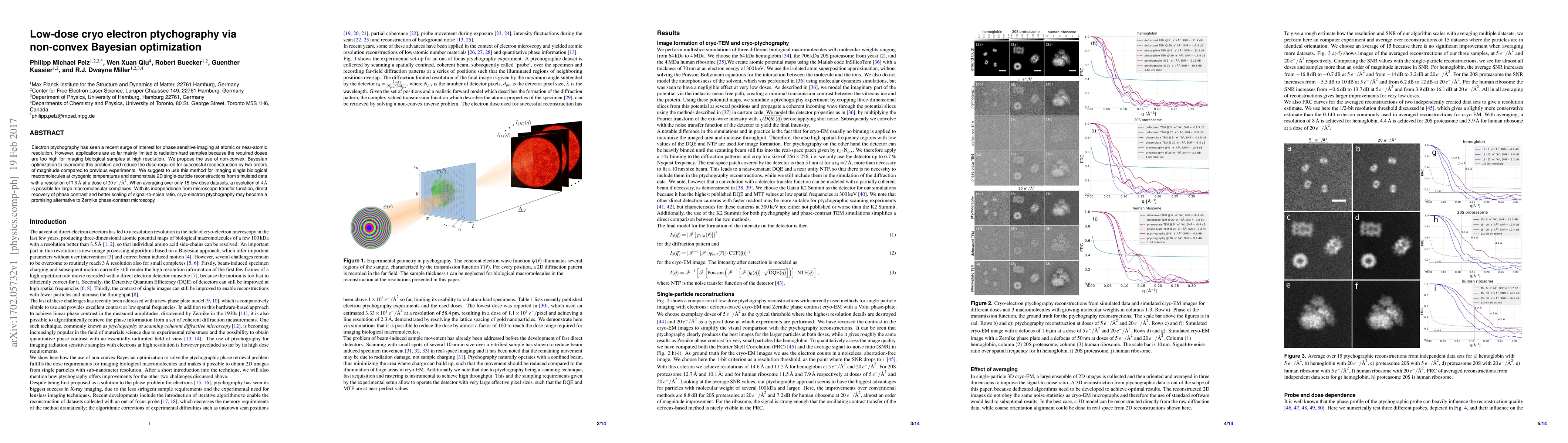This paper proposes a non-convex Bayesian optimization technique to significantly reduce the electron dose required for cryo electron ptychography, enabling high-resolution imaging of biological macromolecules. The method achieves a two-order-of-magnitude dose reduction, enabling 2D reconstructions at 7.9 Å resolution with a dose of 20 $e^- / \AA^2$, and 4 Å resolution for large complexes by averaging 15 low-dose datasets.